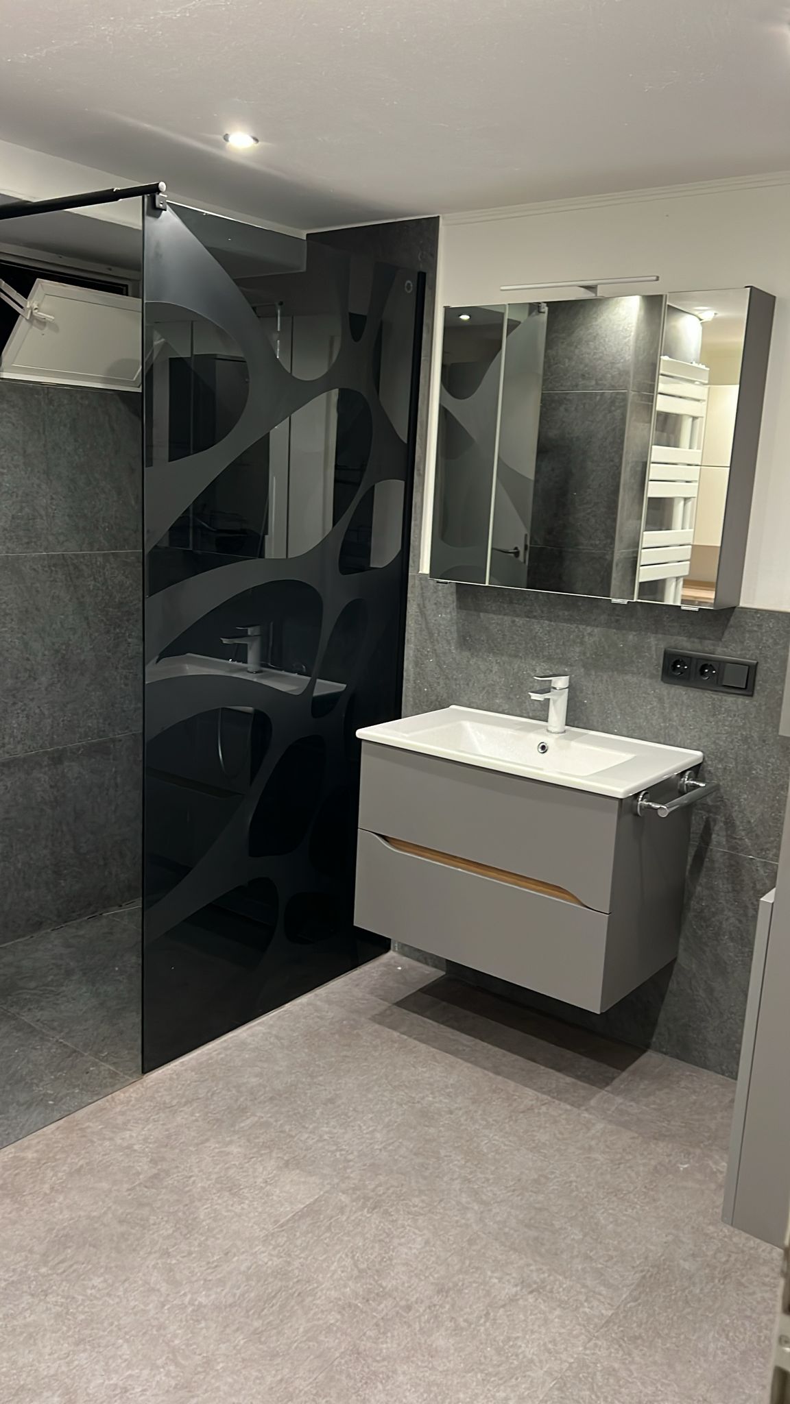 Das moderne Tageslichtbad ist mit hochwertigen Einbauschränken sowie einer Wellness-Dusche ausgestattet.