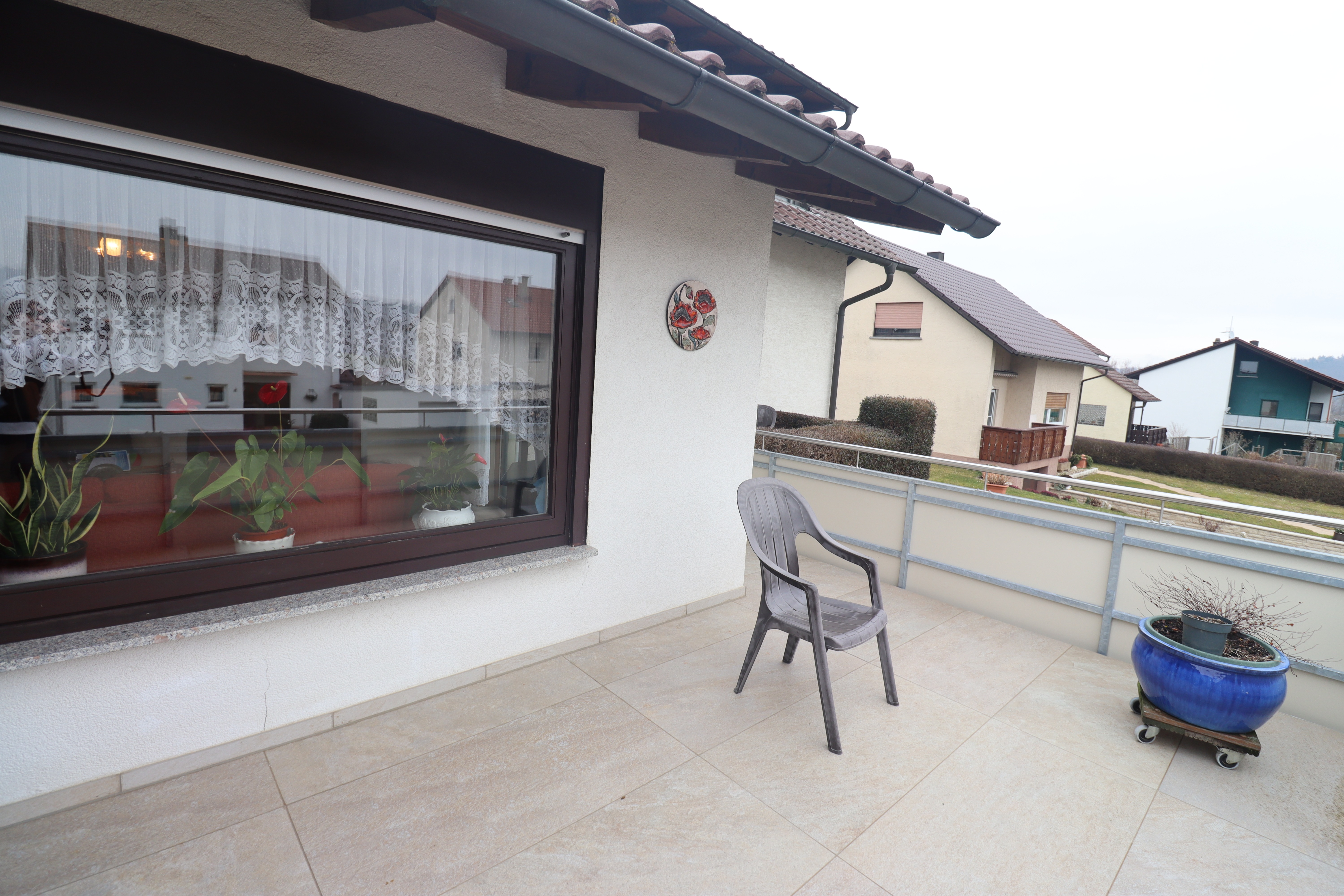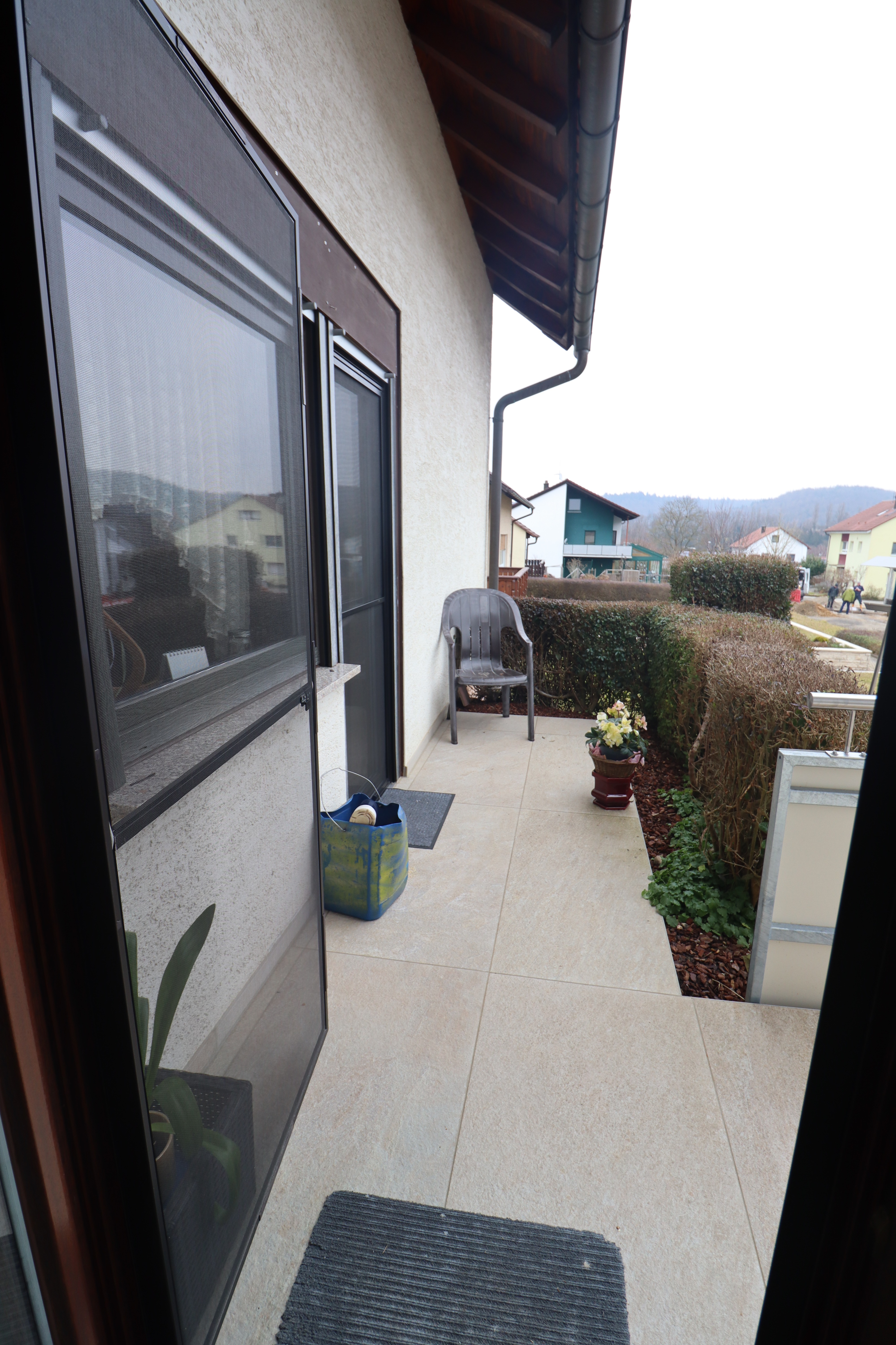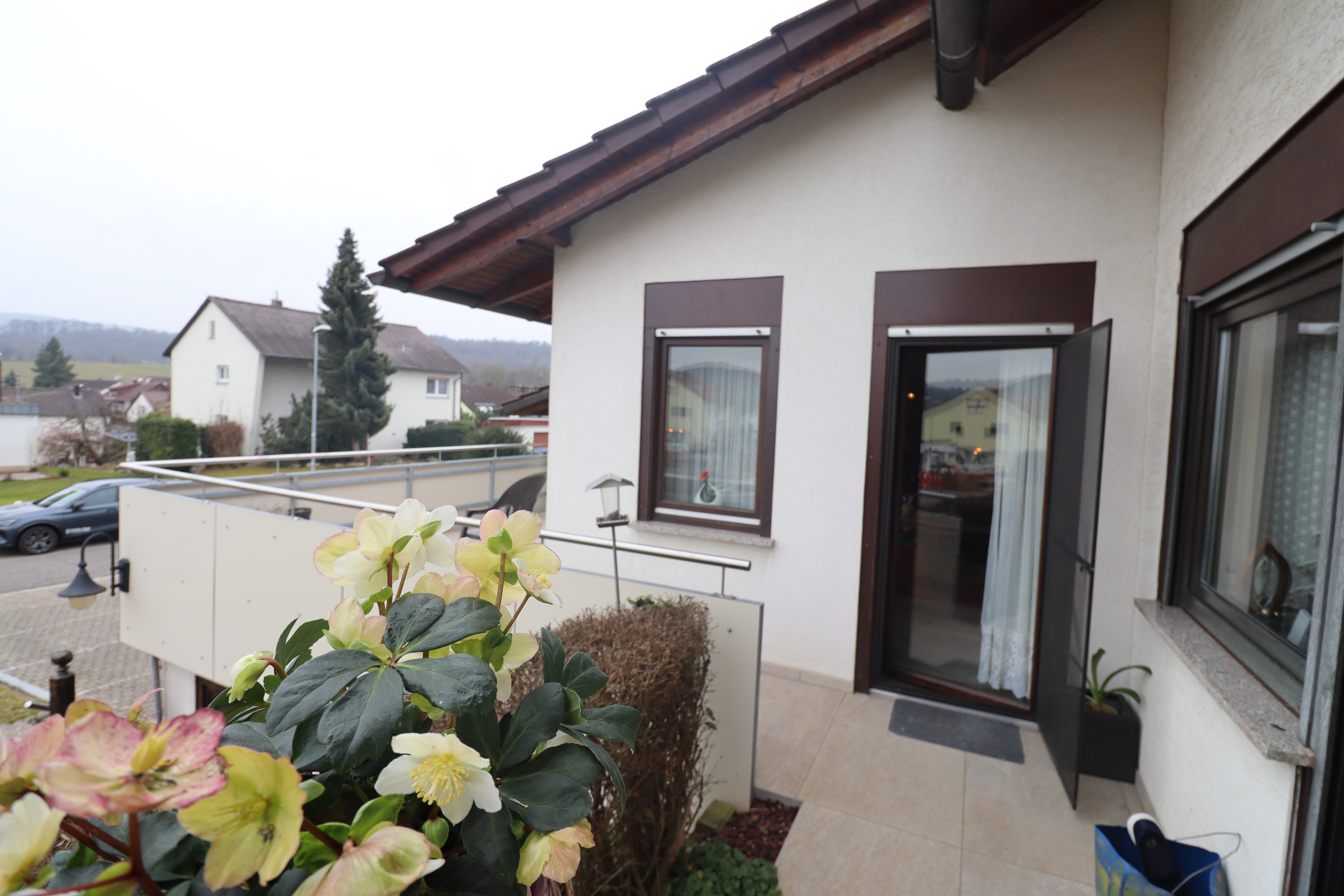 Vom Wohnzimmer aus gelangen Sie auf die Terrasse mit Südausrichtung zur Straßenseite – ideal für sonnige Stunden über den Tag hinweg.