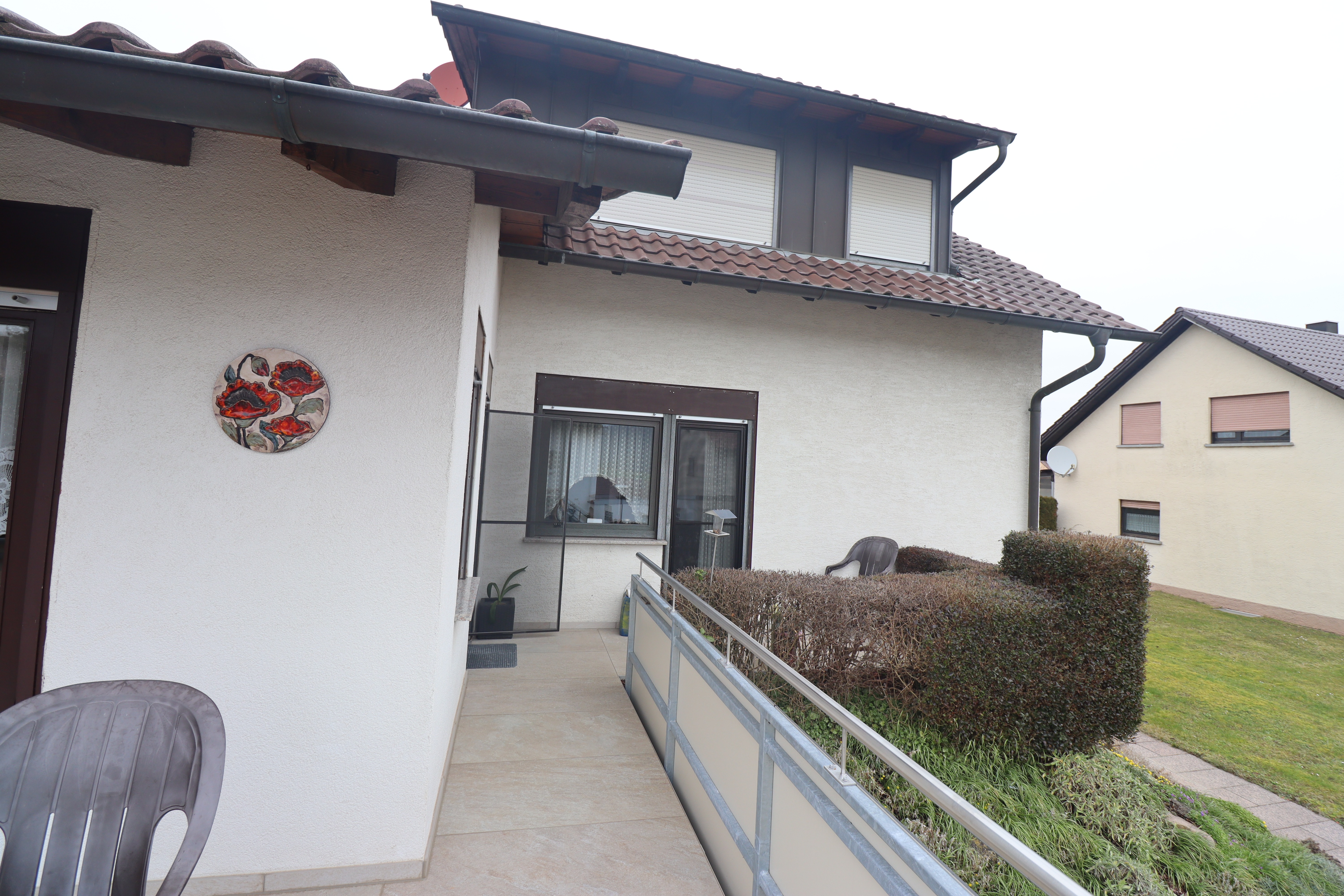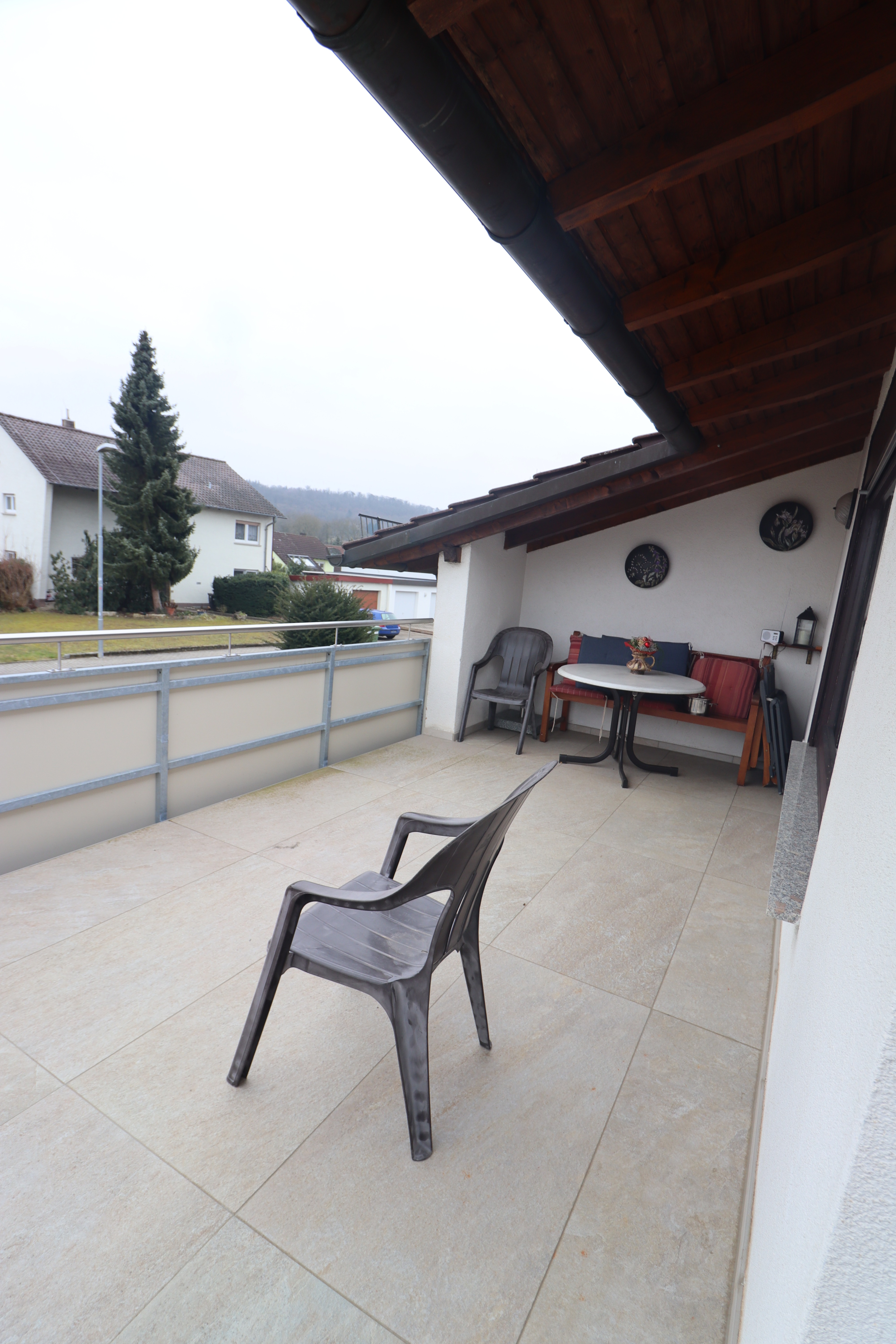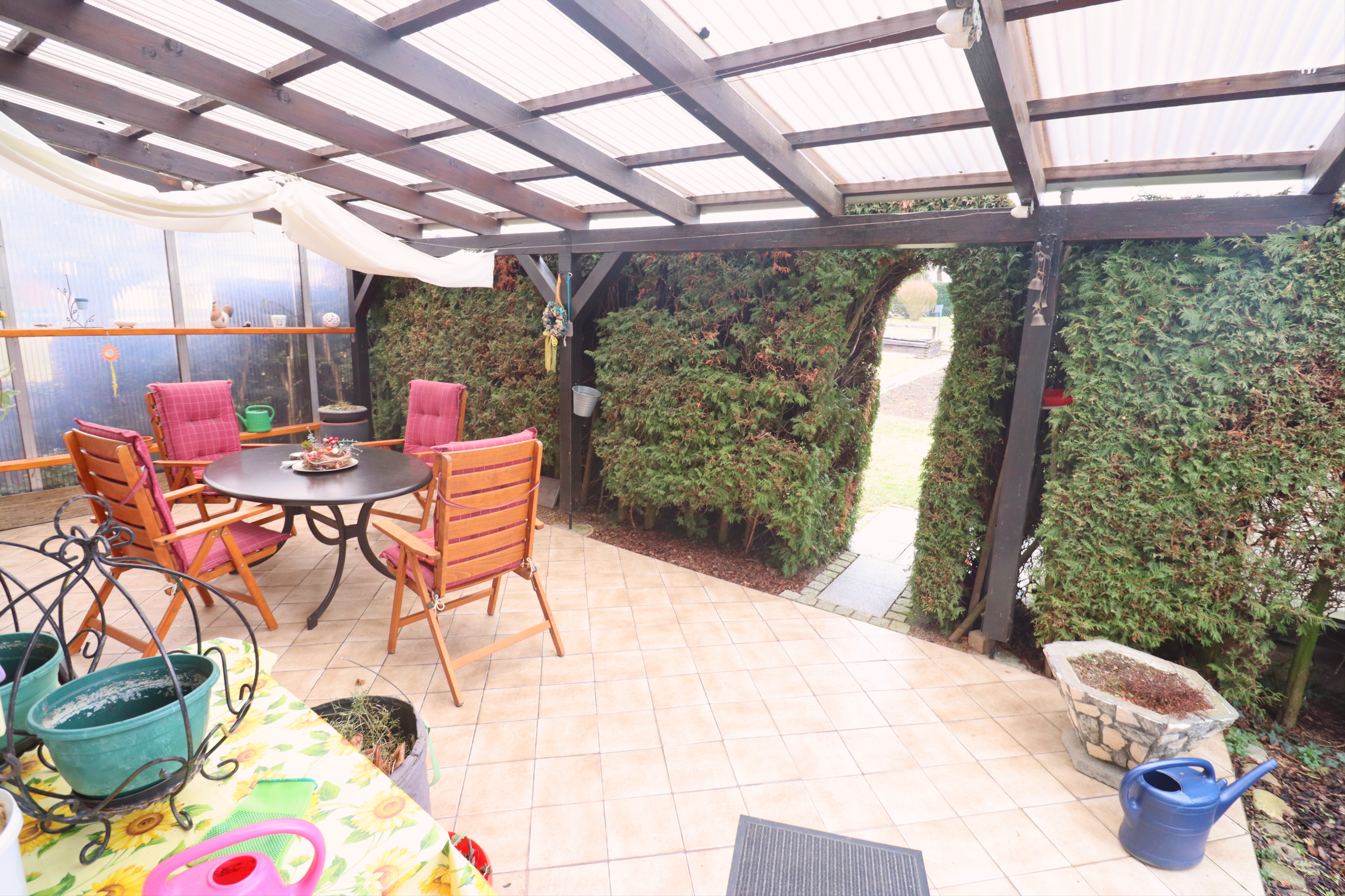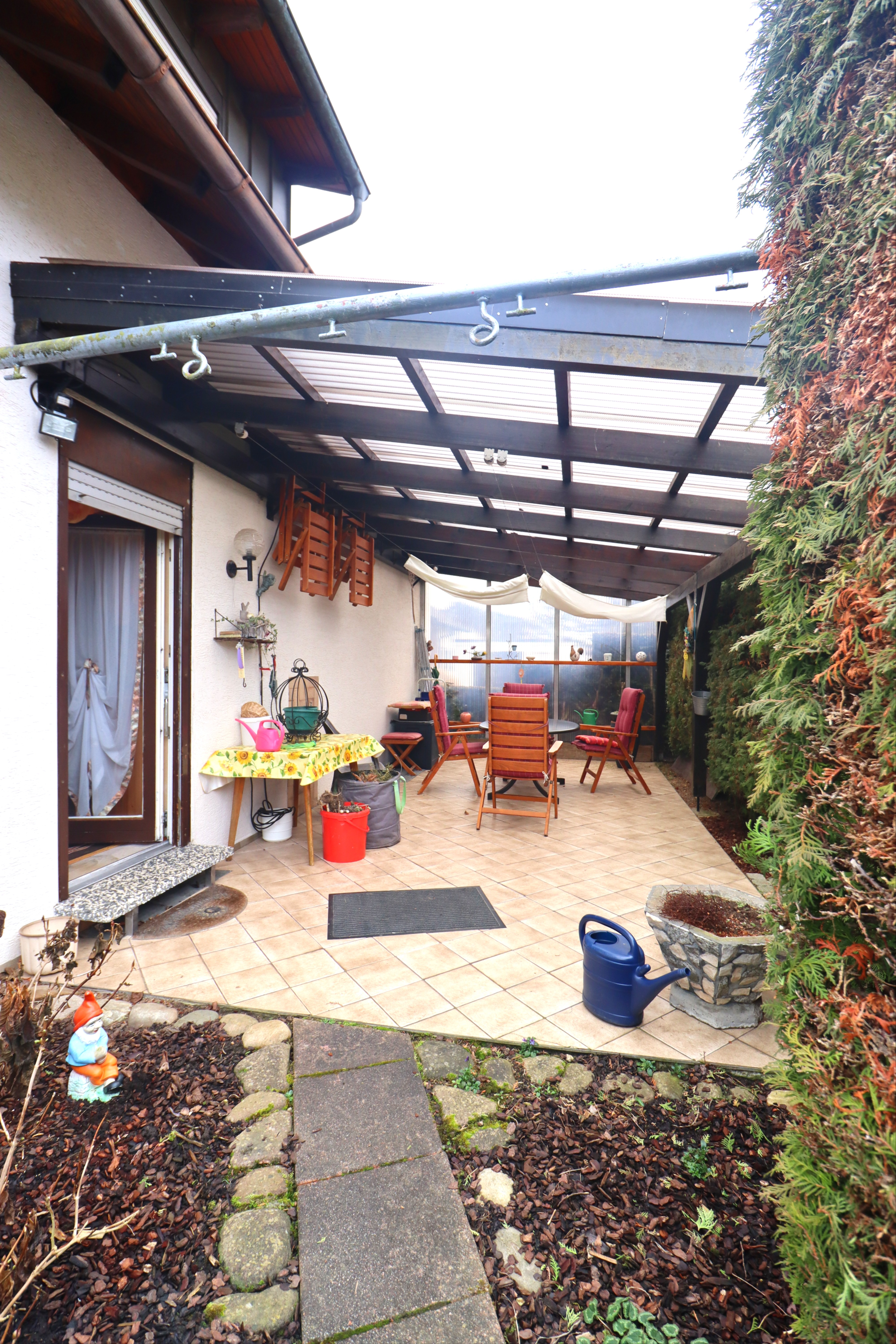 Eine zweite, überdachte und blickgeschützte Terrasse ist direkt vom Gästezimmer aus begehbar. Diese Terrasse liegt auf der Gartenseite mit Nordausrichtung und ist unmittelbar mit dem großen Garten verbunden. Der Zugang vom Gästezimmer auf die überdachte Terrasse schafft eine besonders schöne Verbindung zwischen Innen- und Außenbereich.