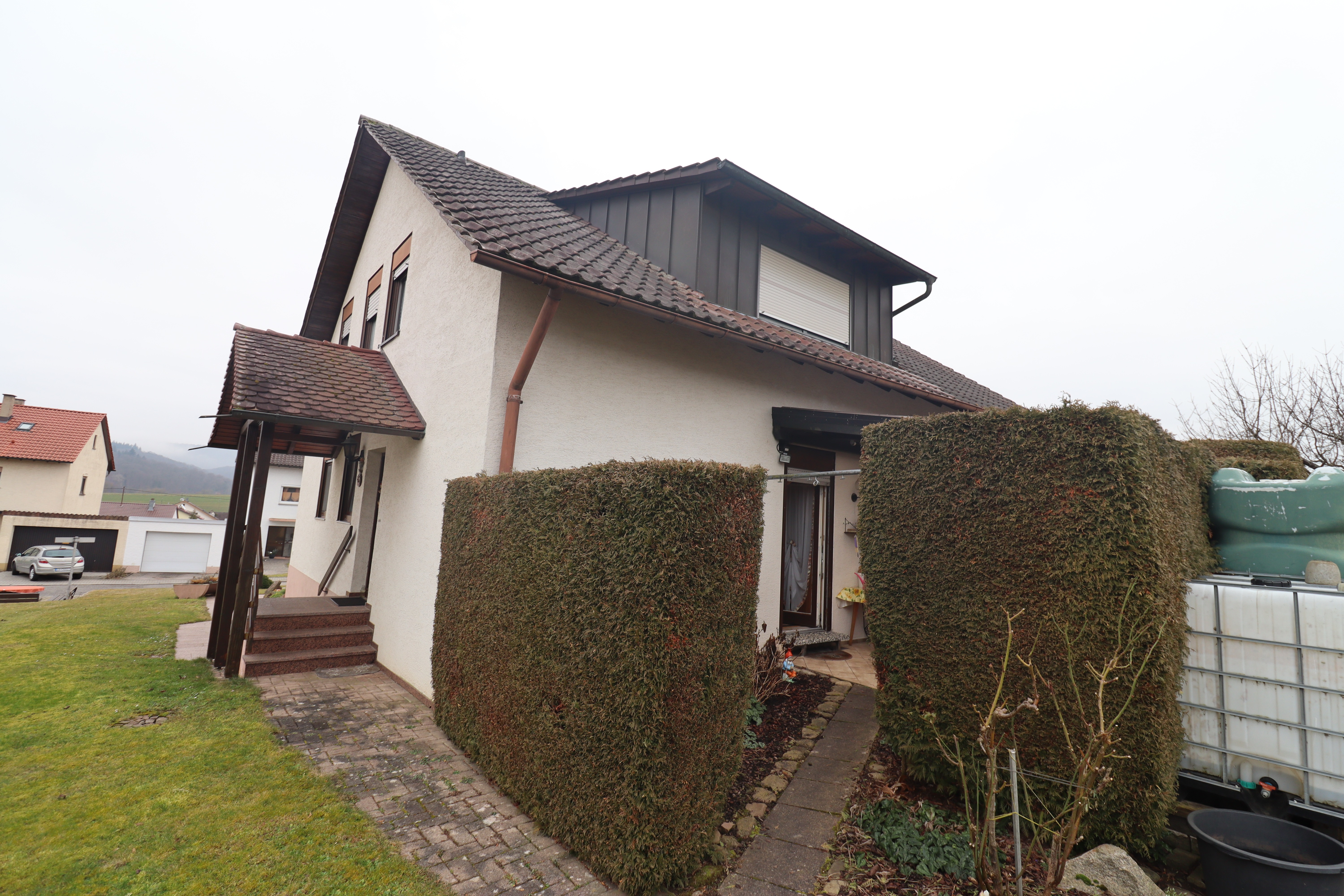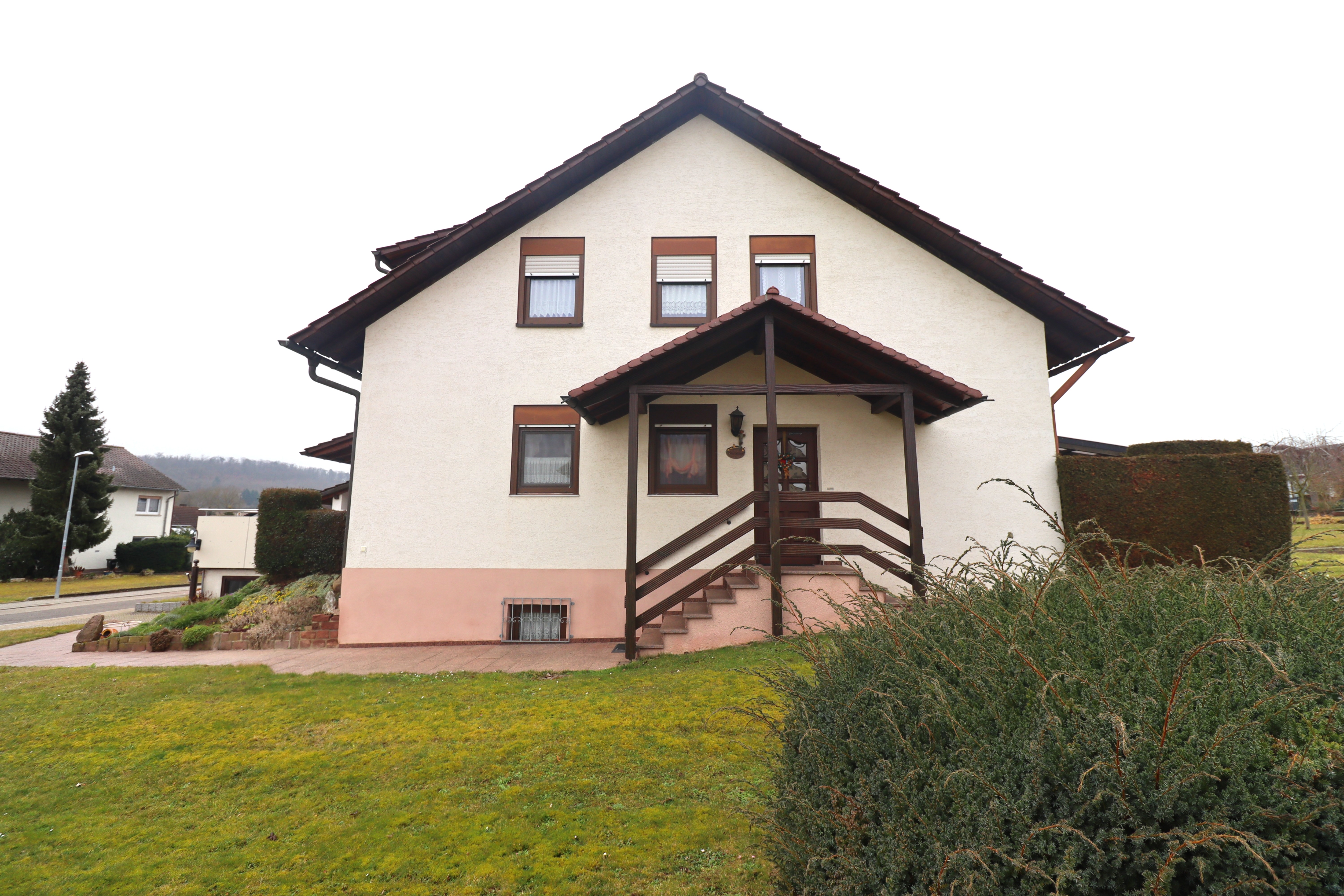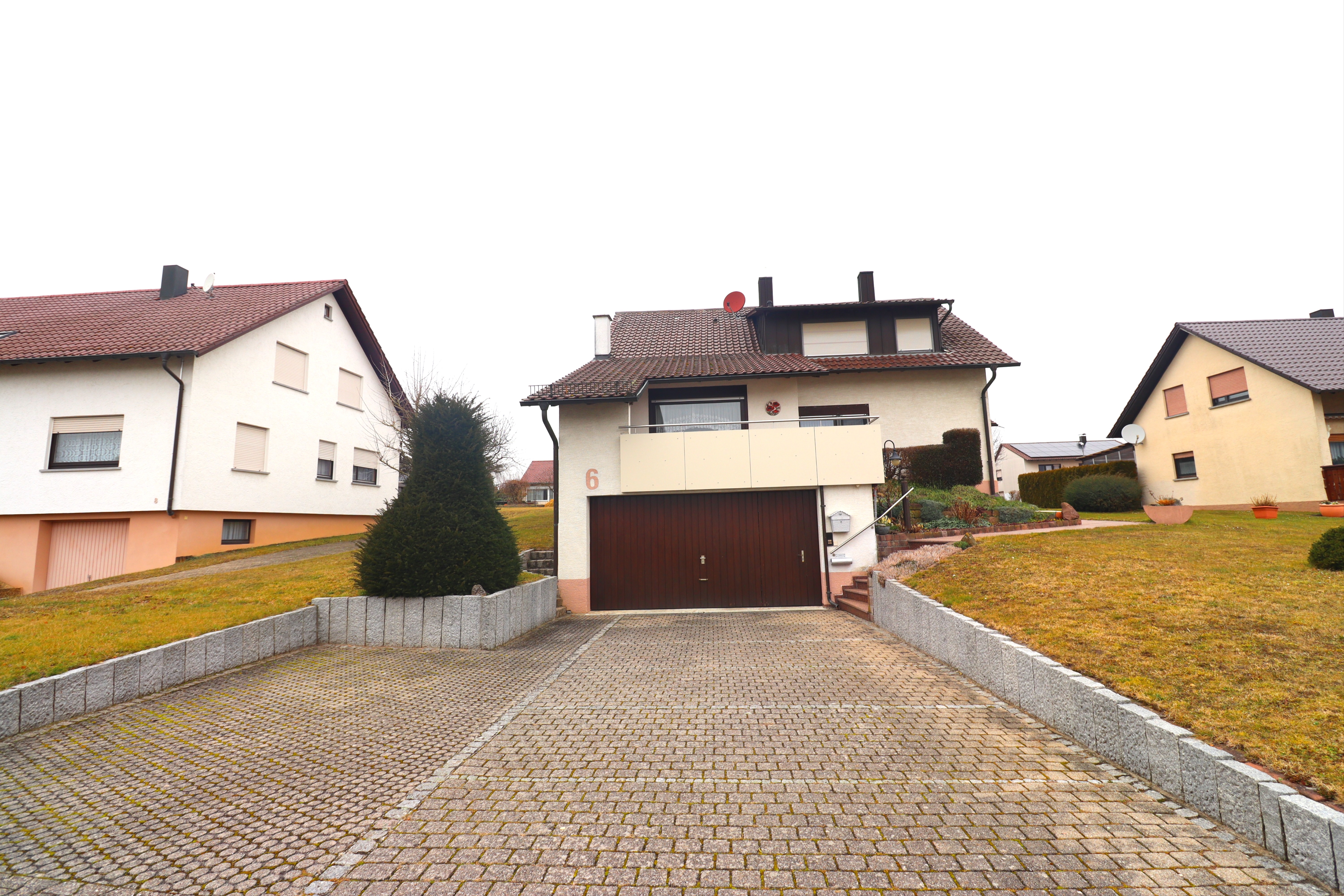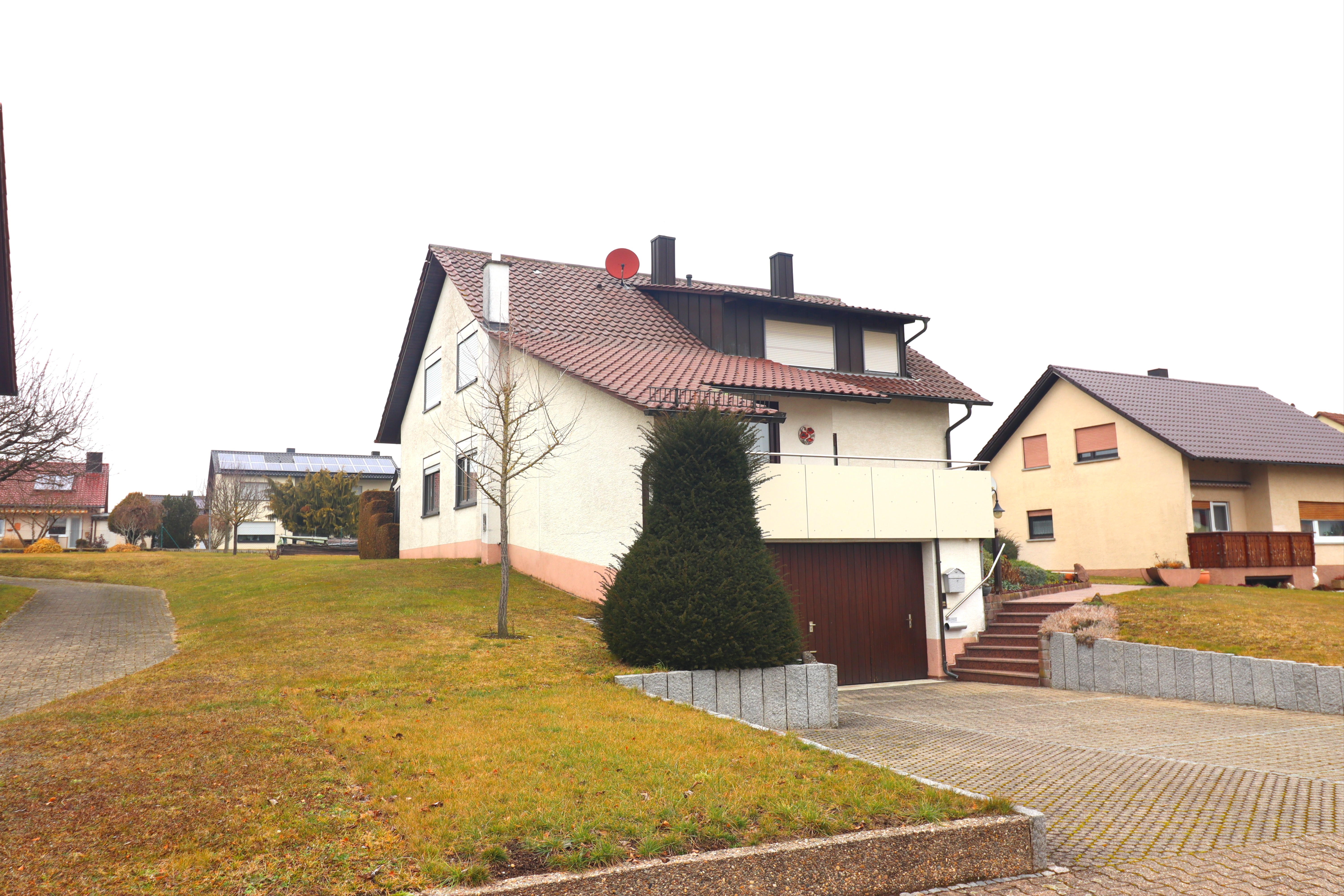 Das Wohnhaus ist harmonisch auf dem Grundstück angeordnet und bietet dadurch angenehme Abstände zu den Nachbargrundstücken. Die Doppelgarage befindet sich straßenseitig mit direkter Zufahrt; zusätzliche Stellplätze vor und neben der Garage ermöglichen komfortables Parken.