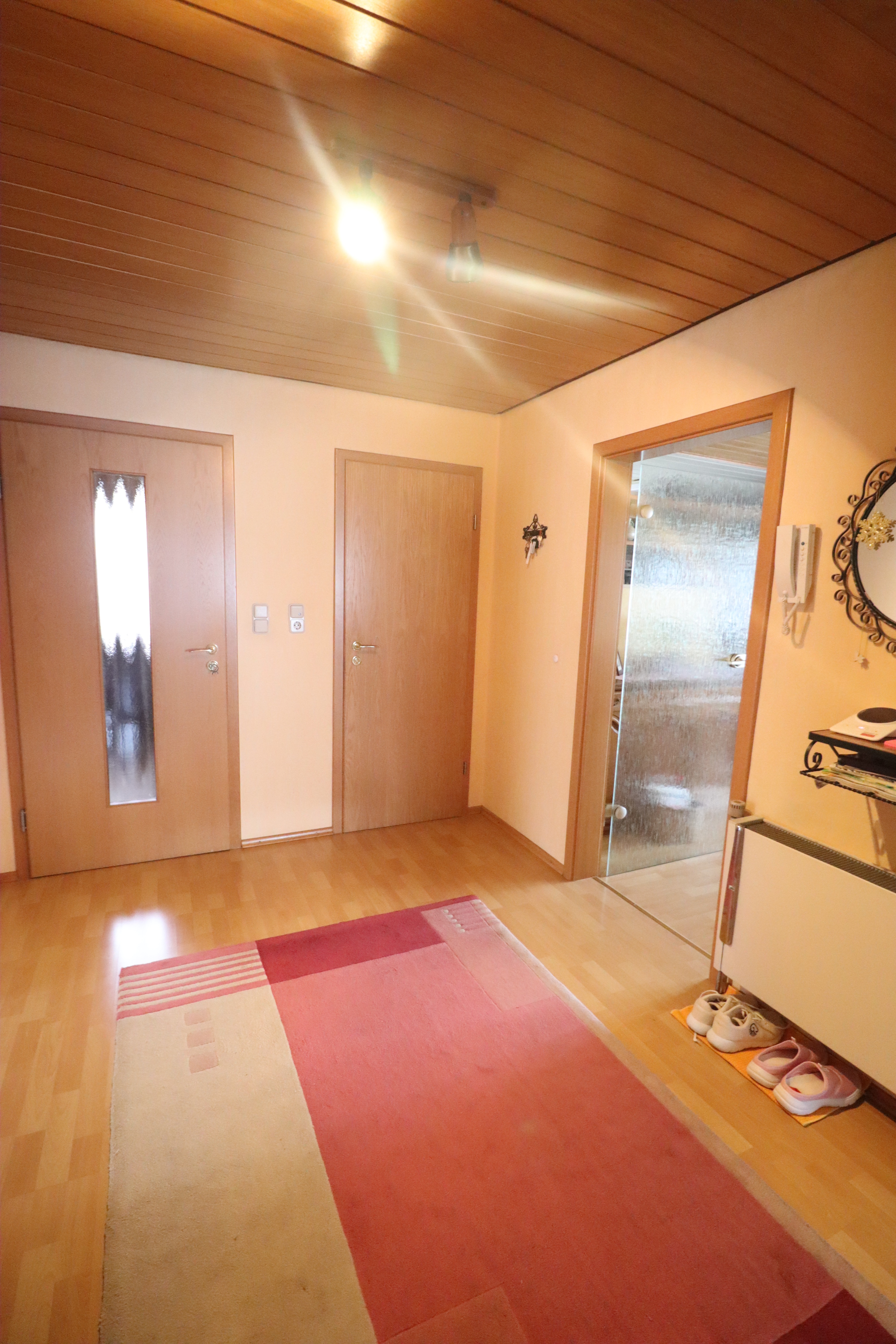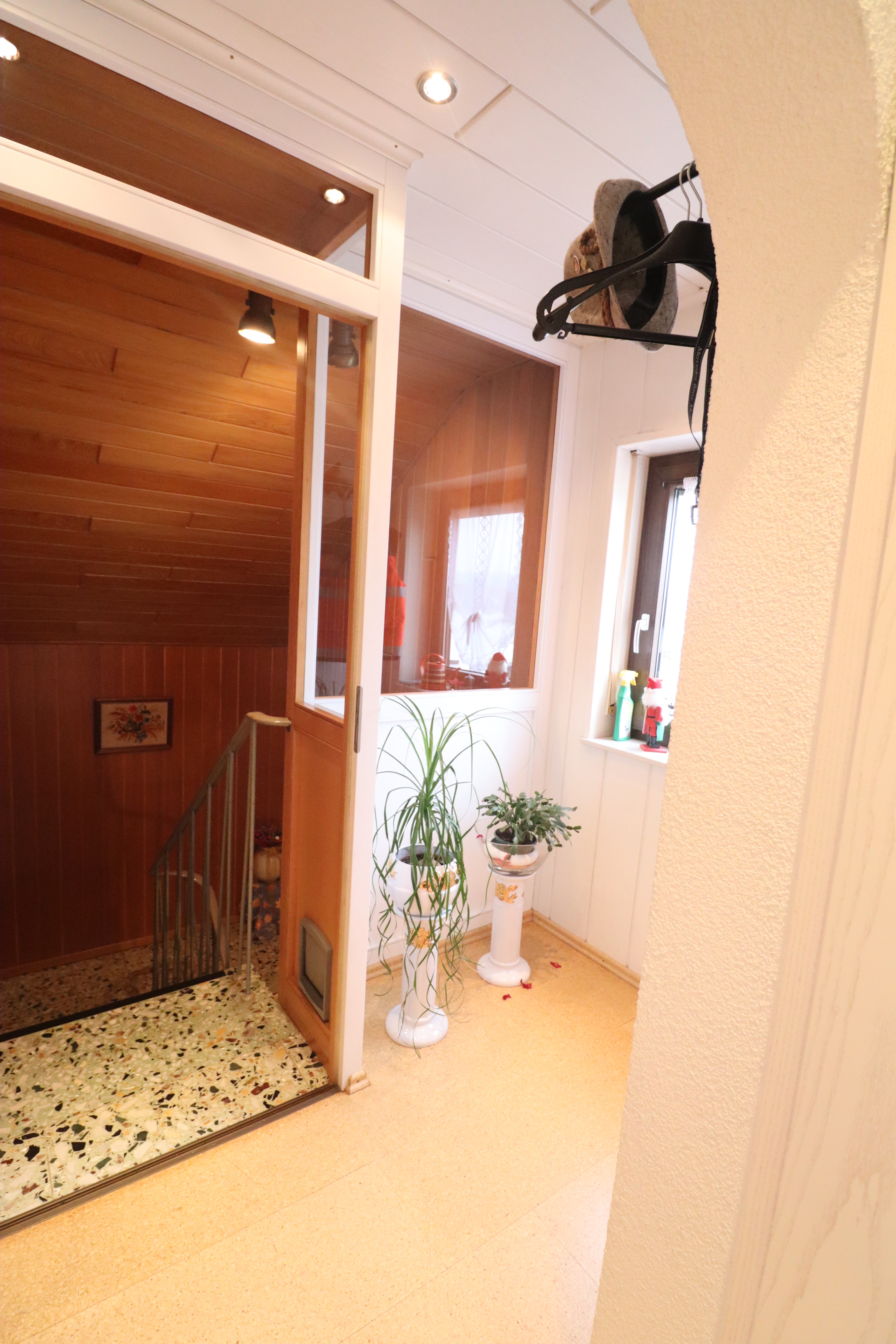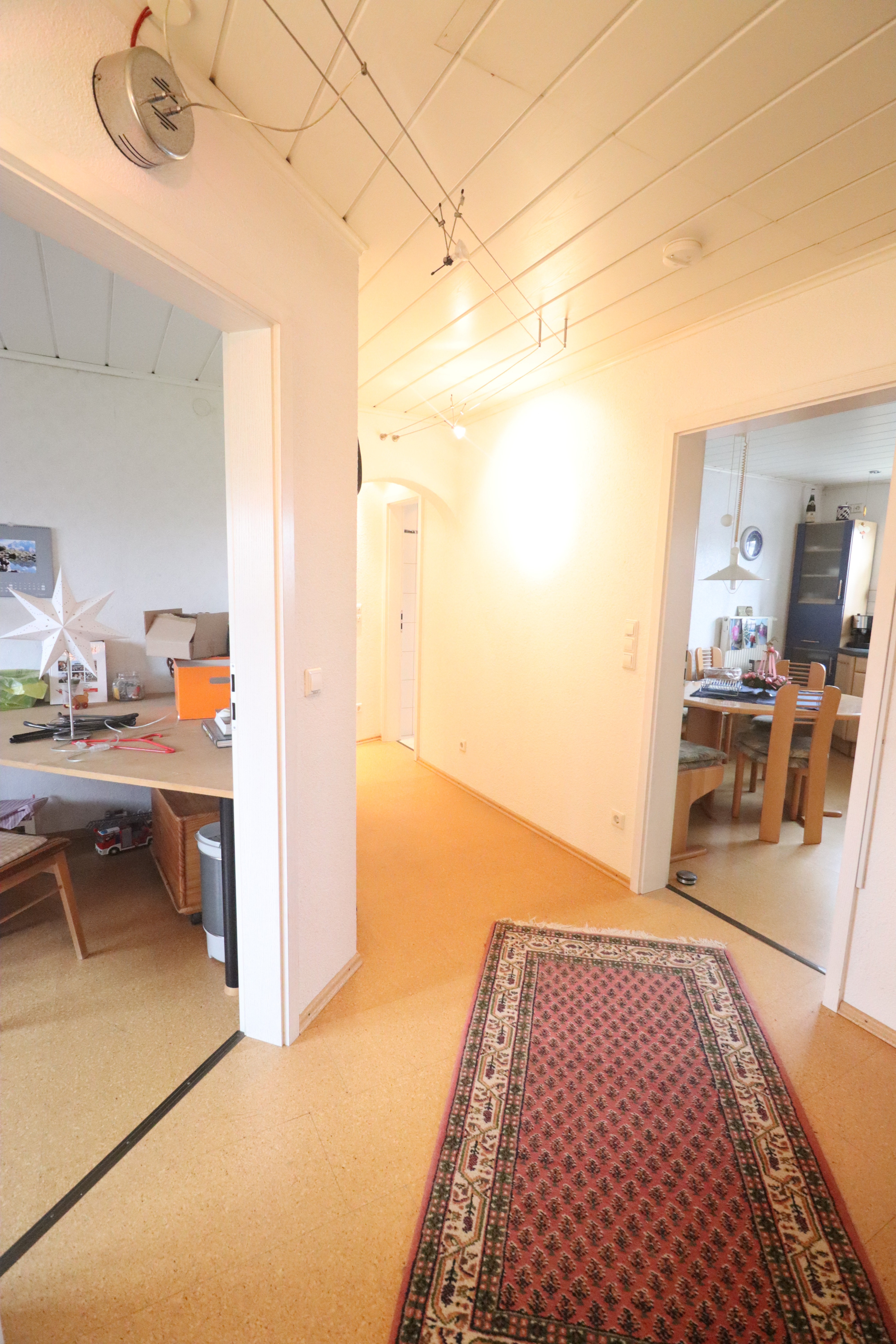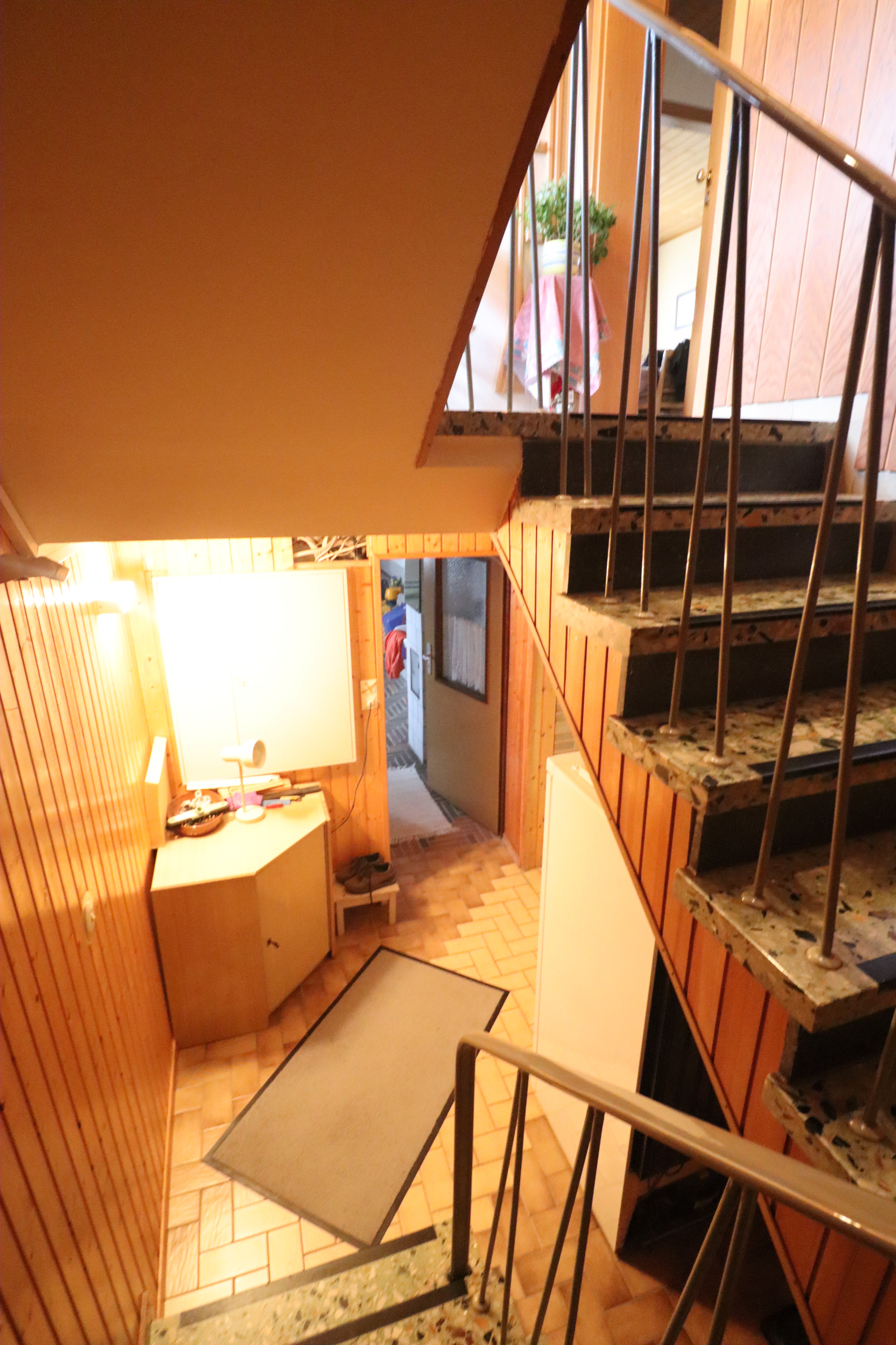 Nach Betreten des Hauses gelangt man in einen großen Flurbereich im Erdgeschoss. Von hier aus führen eine Treppe in das Kellergeschoss sowie eine weitere Treppe in das Dachgeschoss. Die Dachgeschosswohnung ist im oberen Bereich durch eine Tür separat verschließbar.