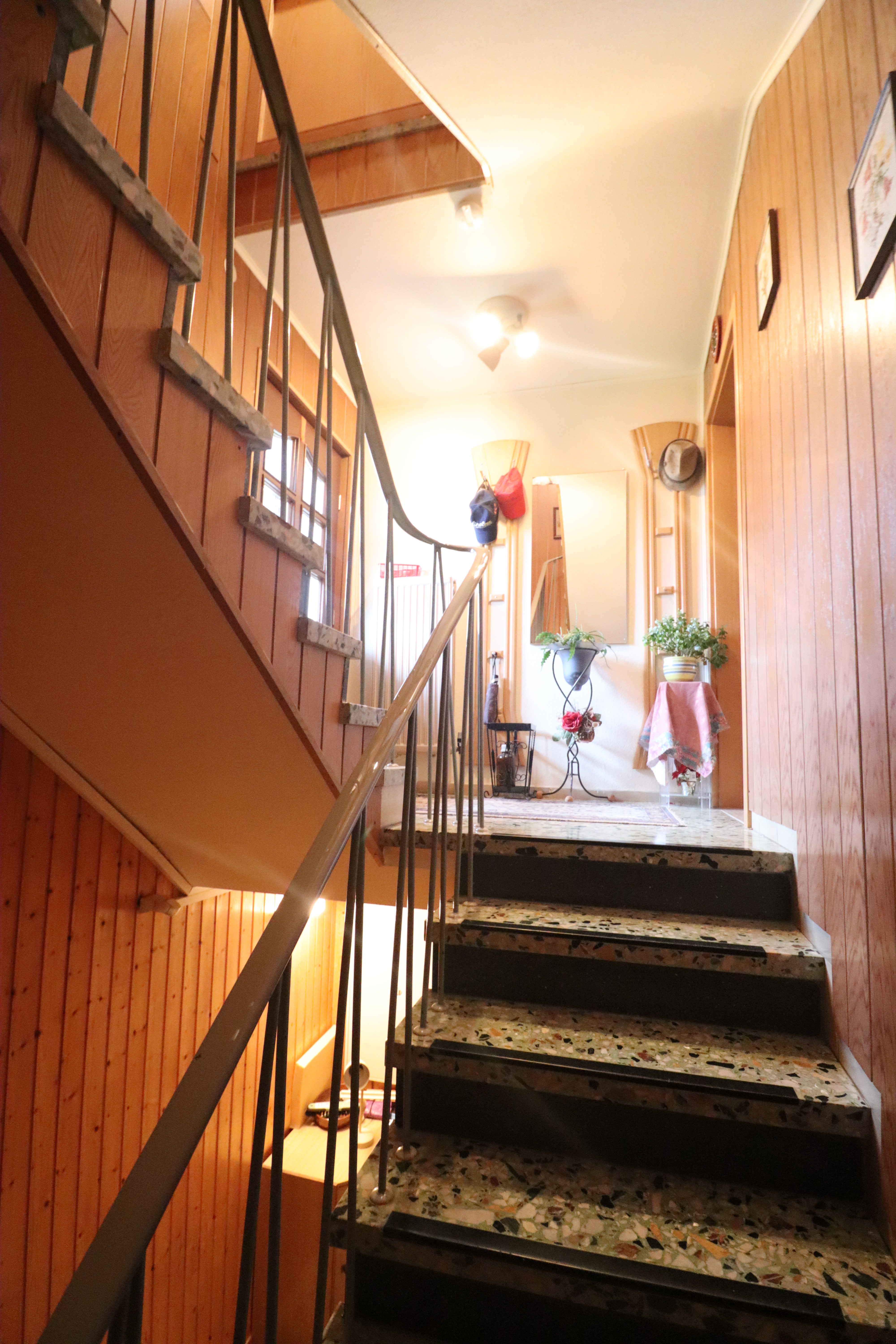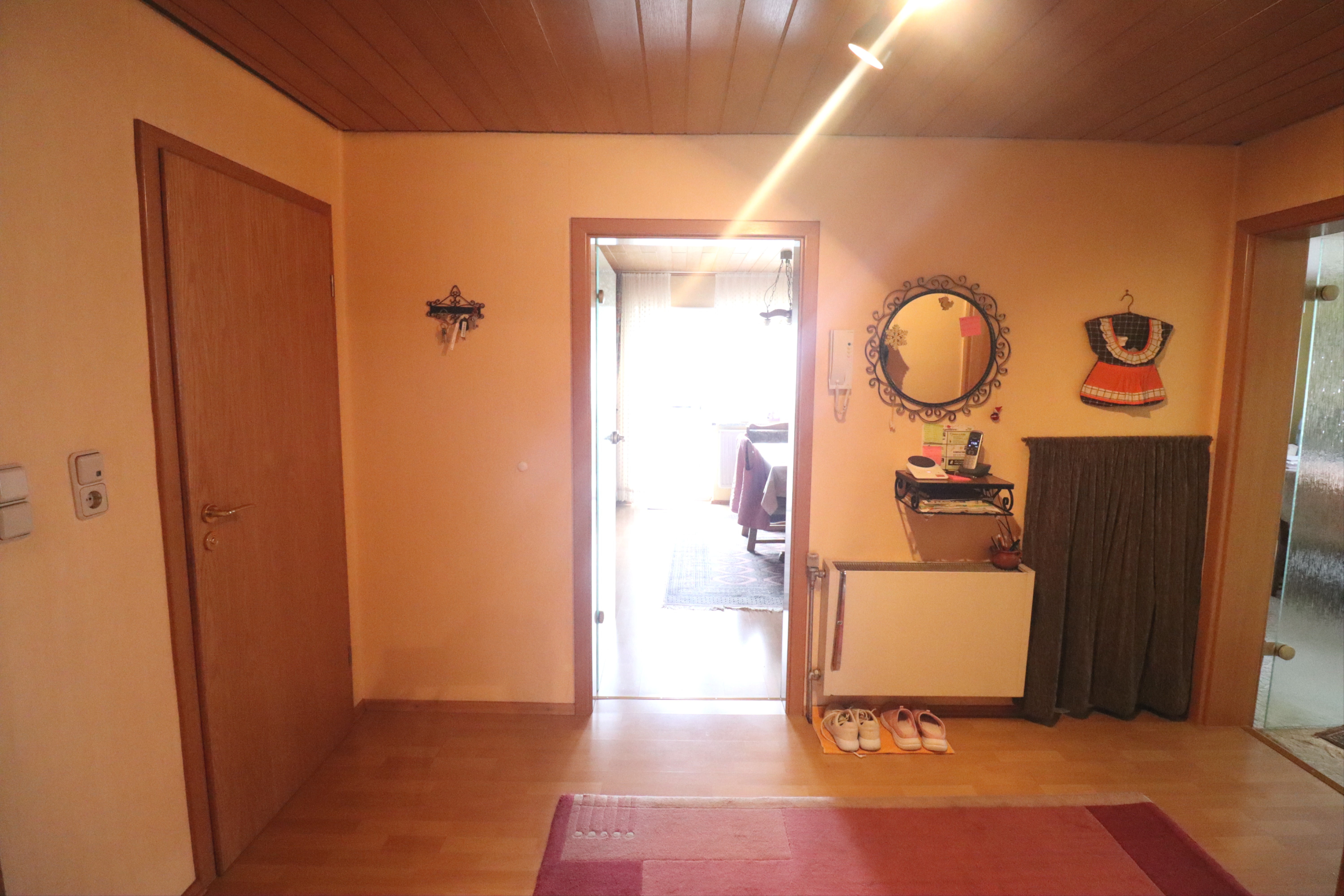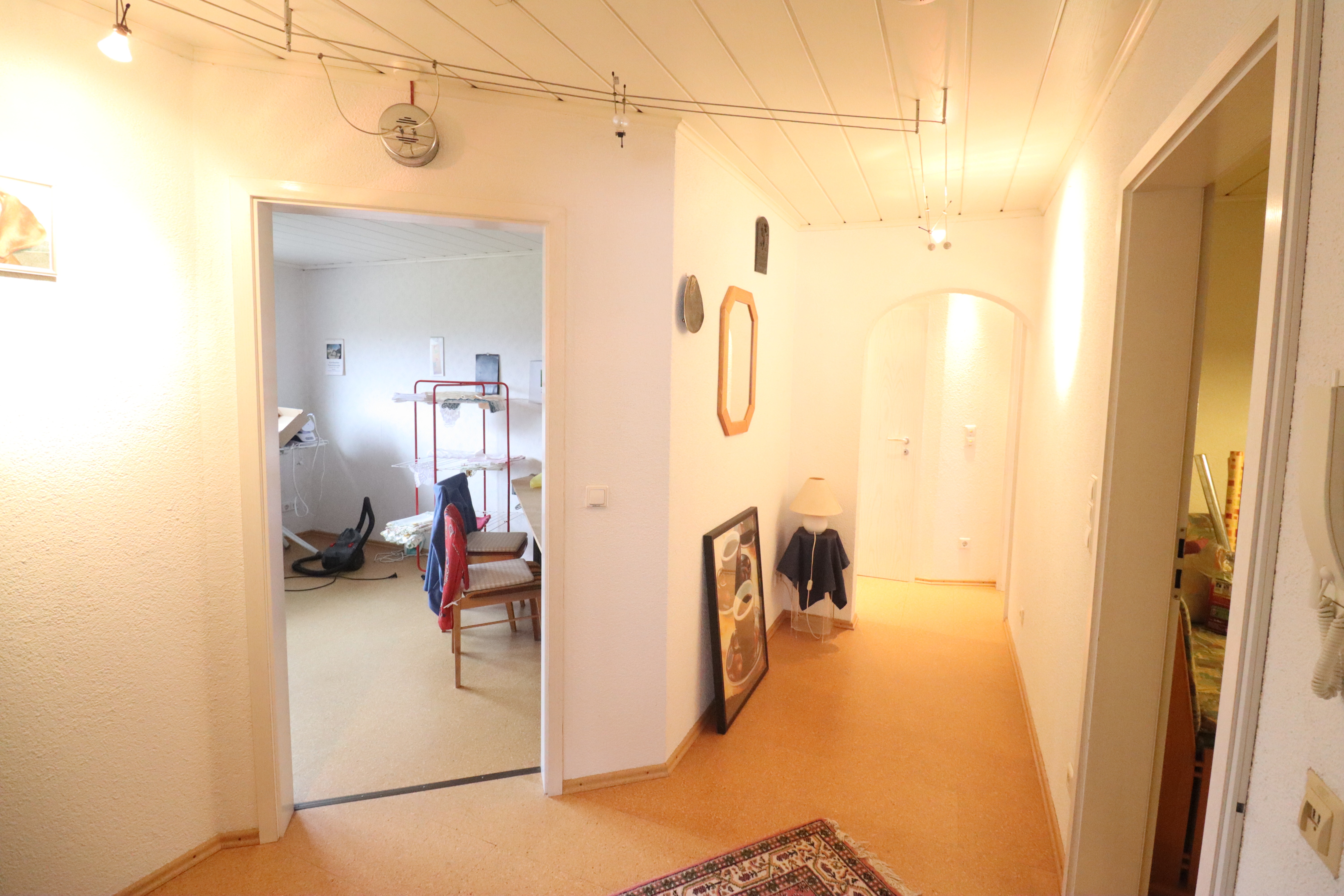 Nach Betreten des Hauses gelangt man in einen großen Flurbereich im Erdgeschoss. Von hier aus führen eine Treppe in das Kellergeschoss sowie eine weitere Treppe in das Dachgeschoss. Die Dachgeschosswohnung ist im oberen Bereich durch eine Tür separat verschließbar.