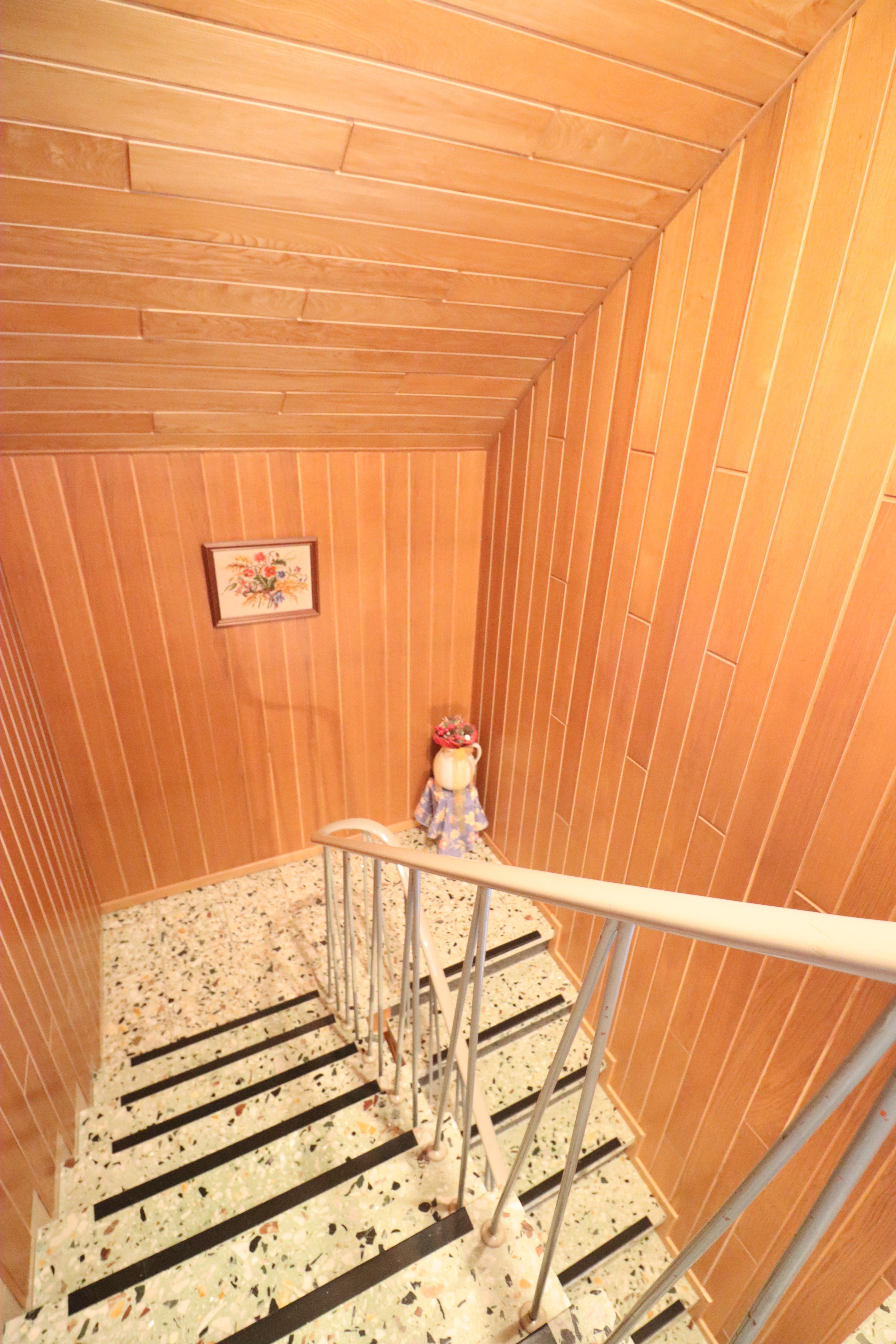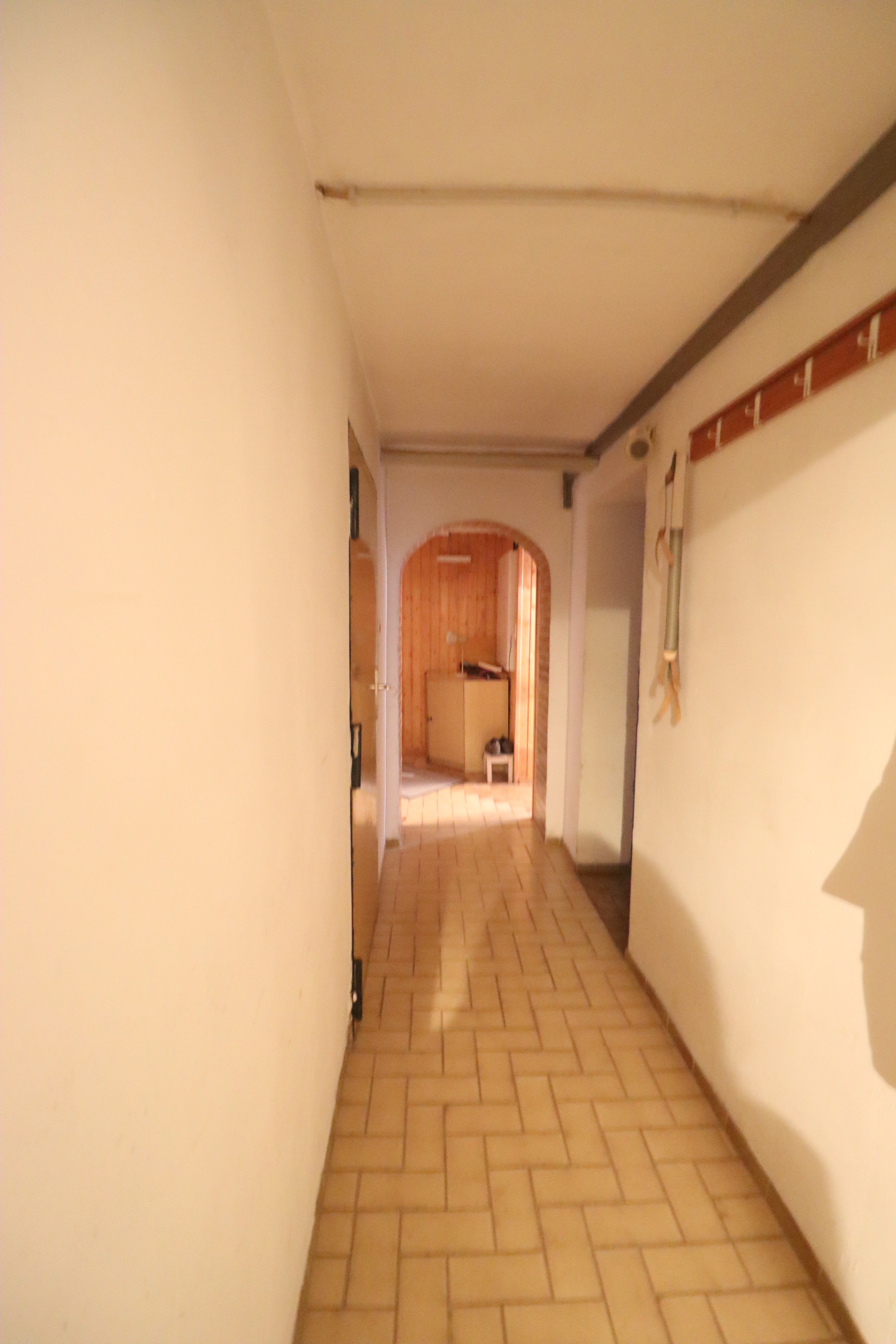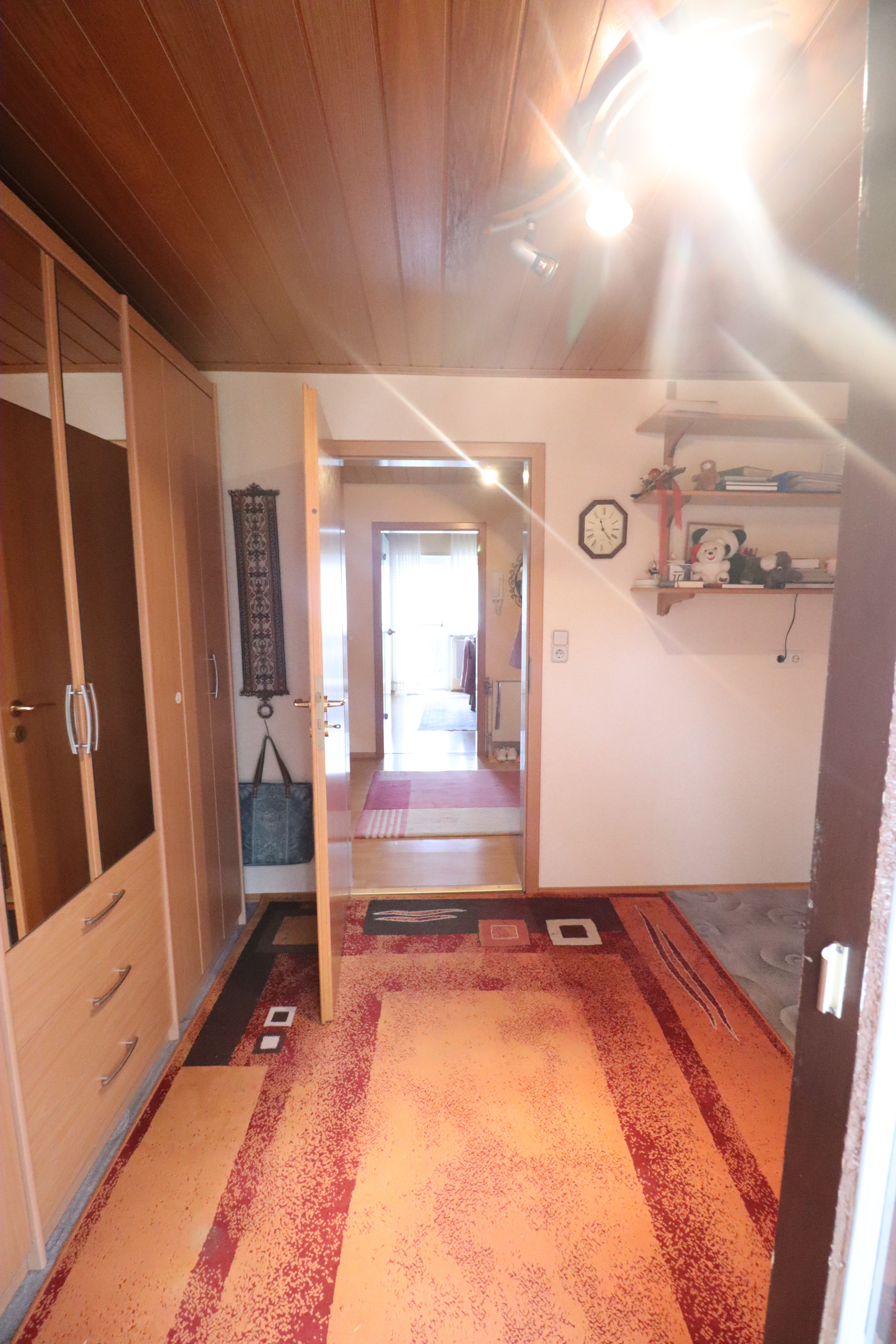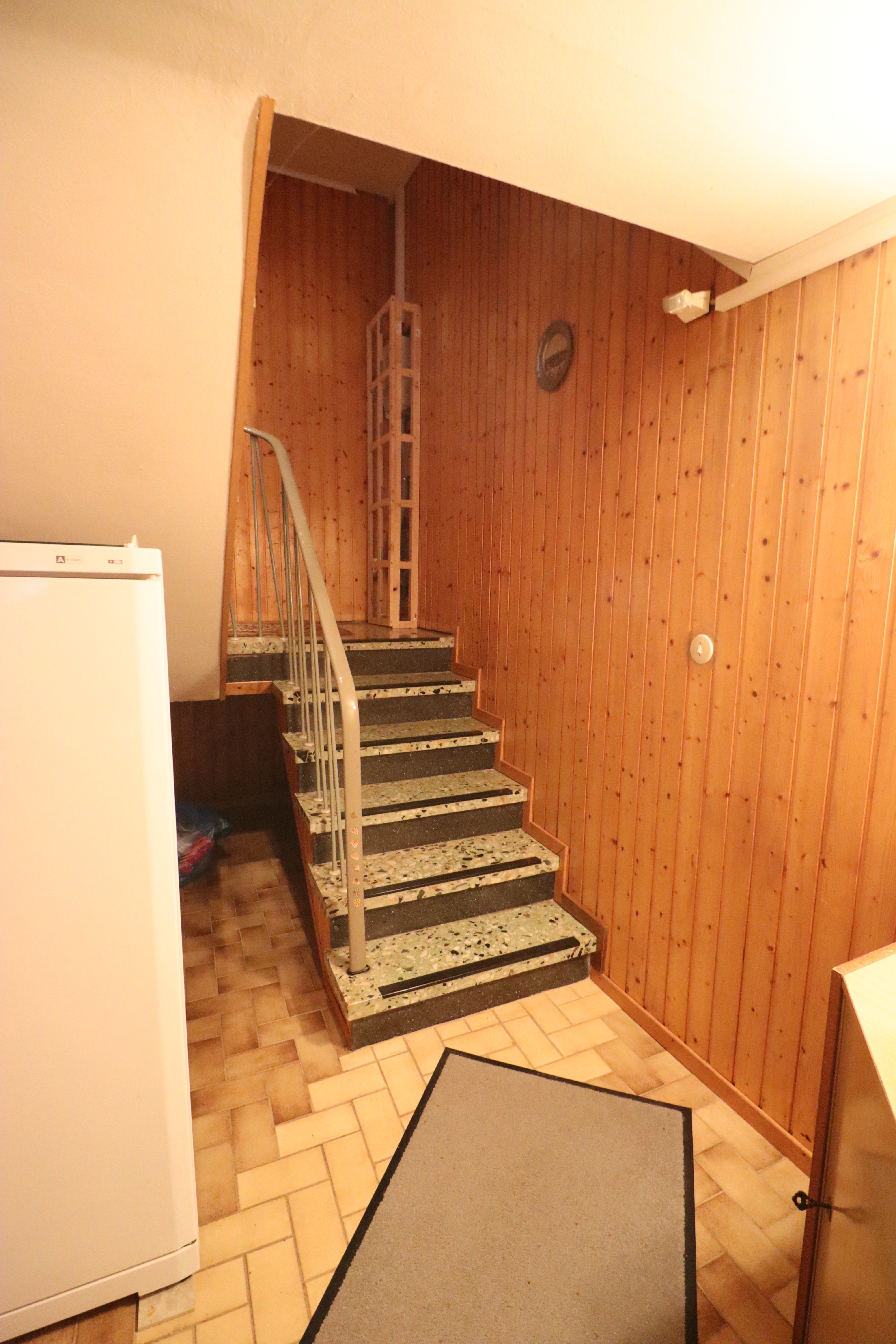 Nach Betreten des Hauses gelangt man in einen großen Flurbereich im Erdgeschoss. Von hier aus führen eine Treppe in das Kellergeschoss sowie eine weitere Treppe in das Dachgeschoss. Die Dachgeschosswohnung ist im oberen Bereich durch eine Tür separat verschließbar.
