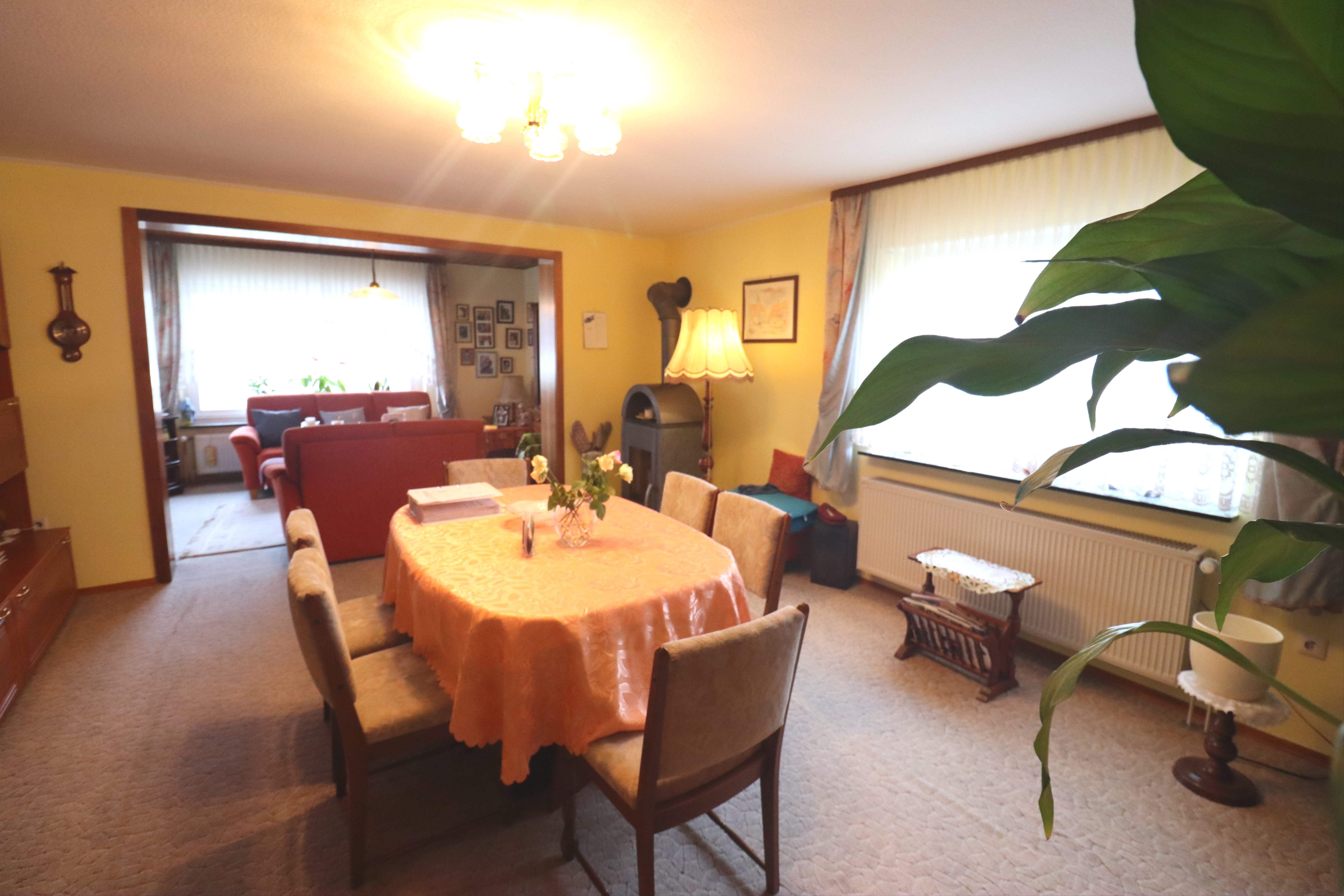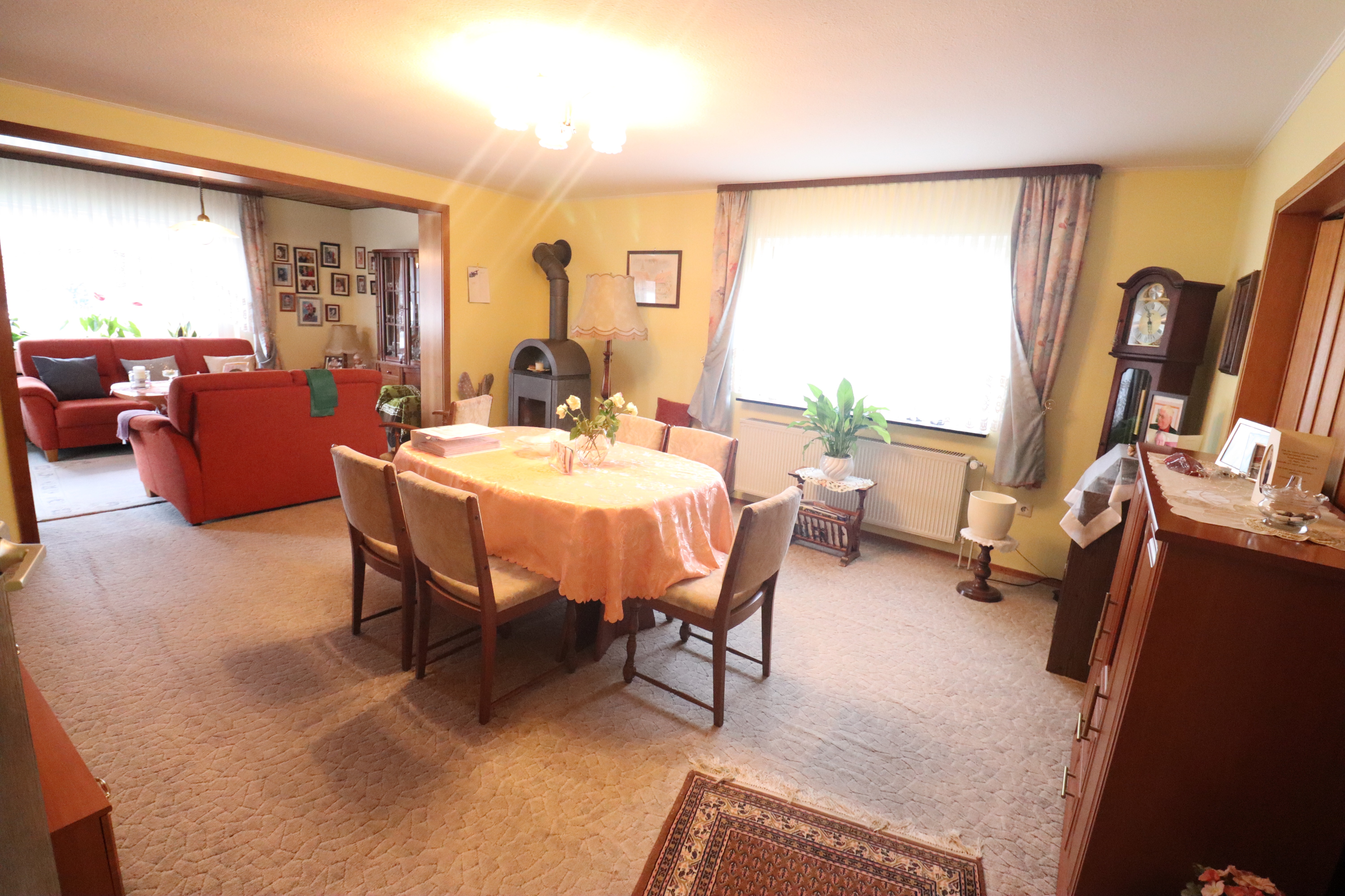 Das großzügige Wohnzimmer wird durch einen integrierten Schwedenofen (im Kaufpreis enthalten) besonders wohnlich.