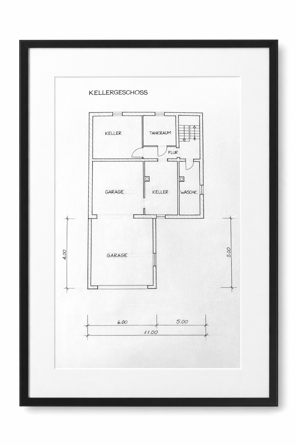 Das Untergeschoss ist funktional und großzügig gestaltet. Es verfügt über mehrere Nutzräume und ist über die zentrale Treppe erreichbar.