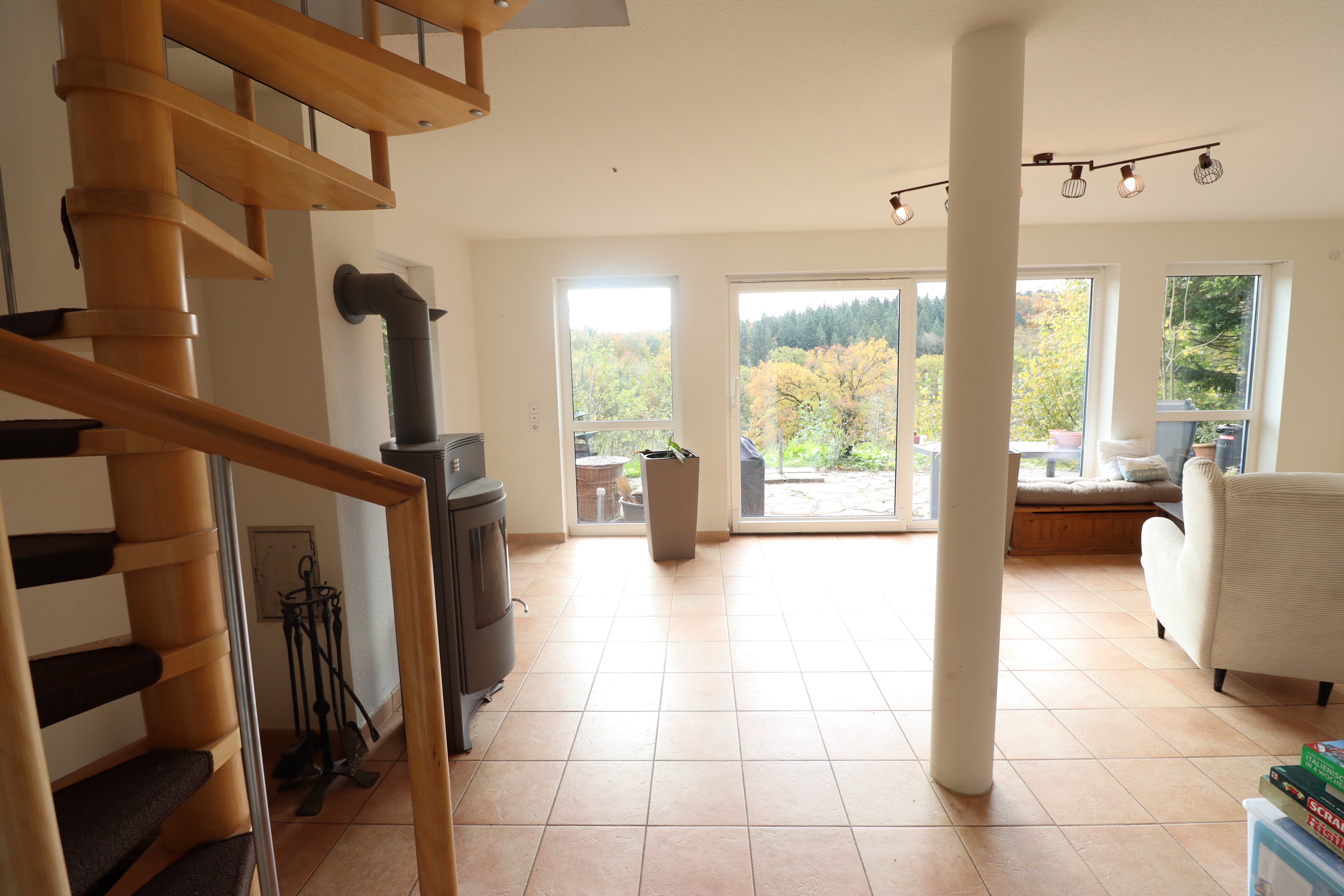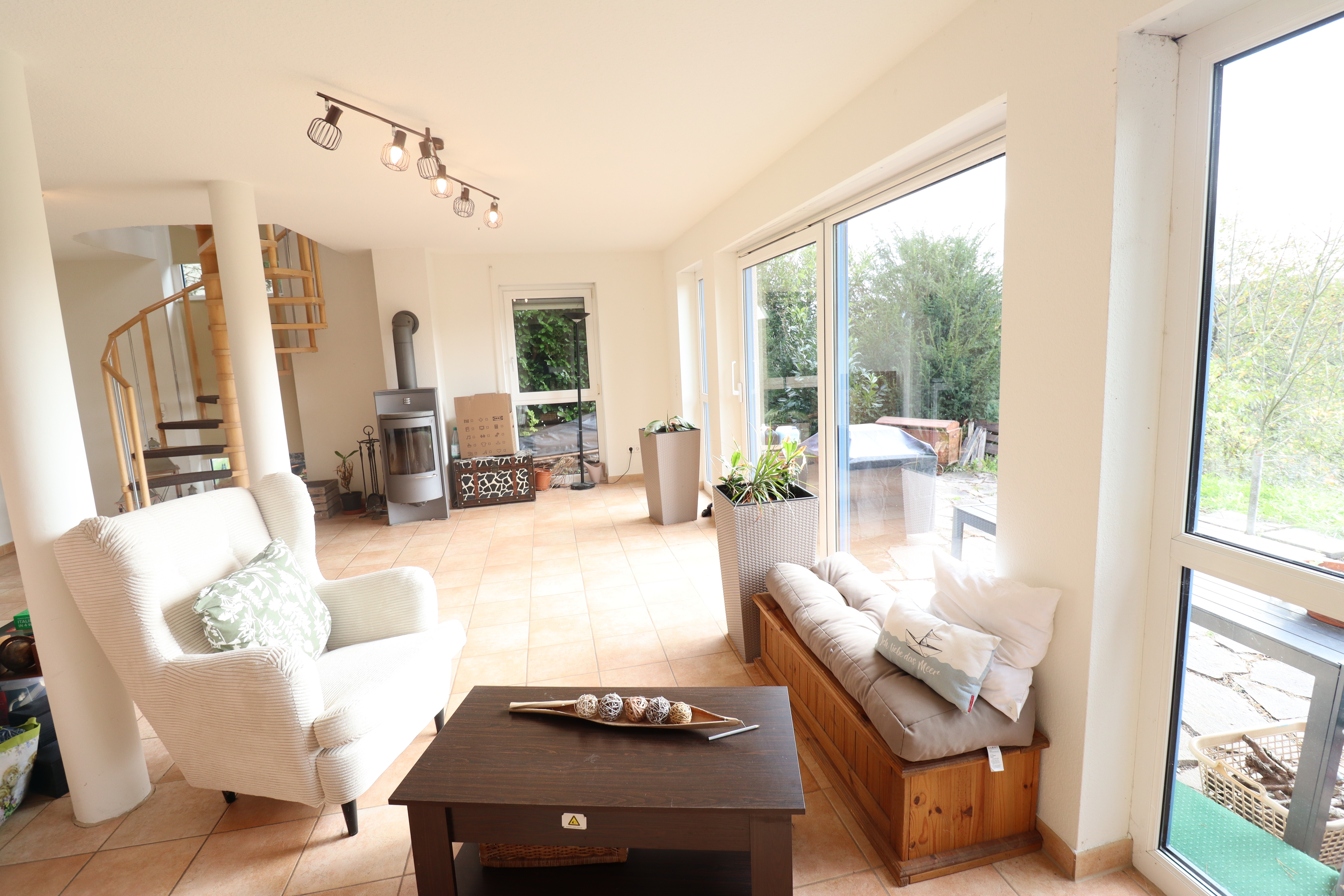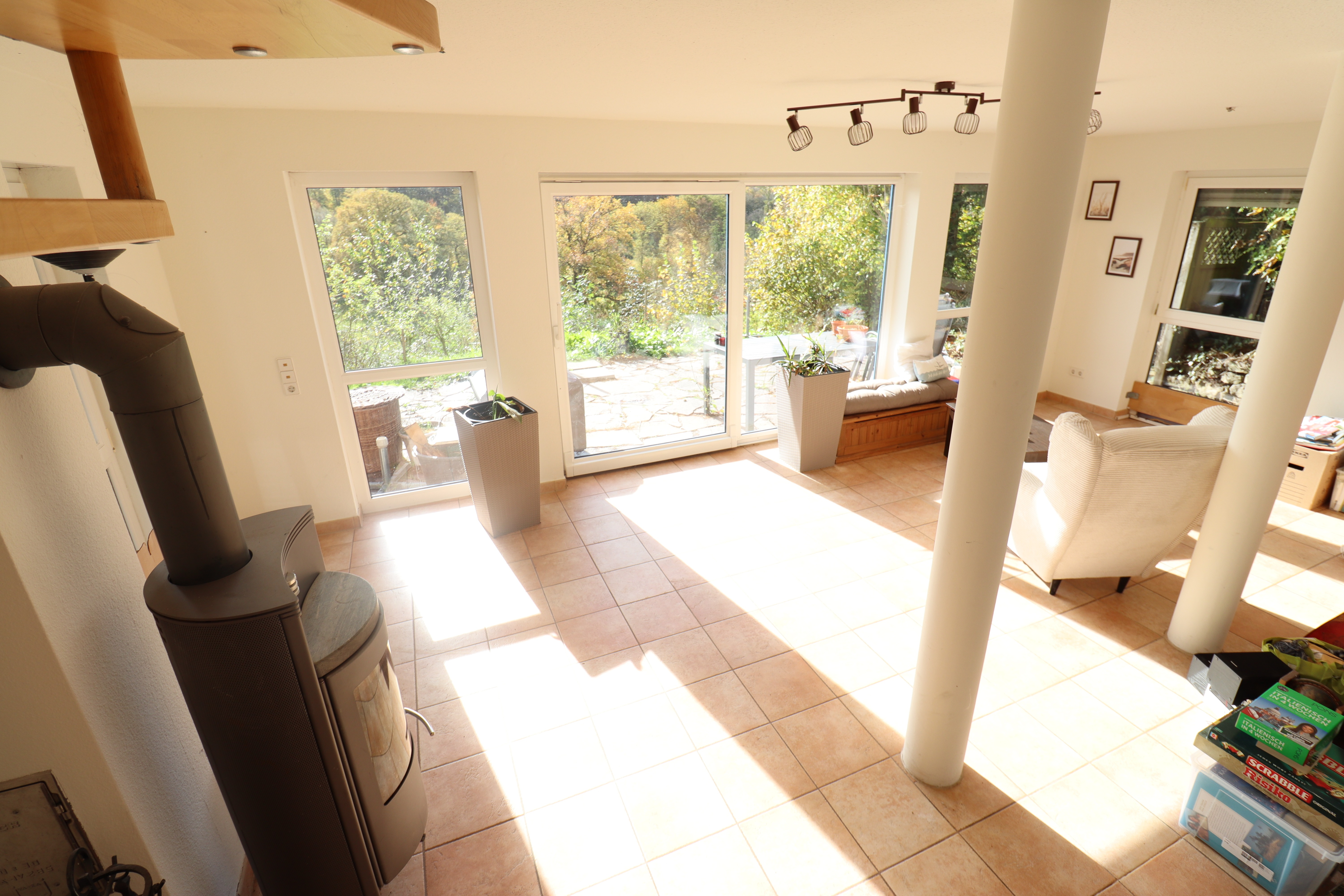 Großzügig geschnitten, lichtdurchflutet und mit direktem Zugang zu den Außenbereichen. Der Kaminofen sorgt in den Wintermonaten für eine angenehme Wohnatmosphäre.