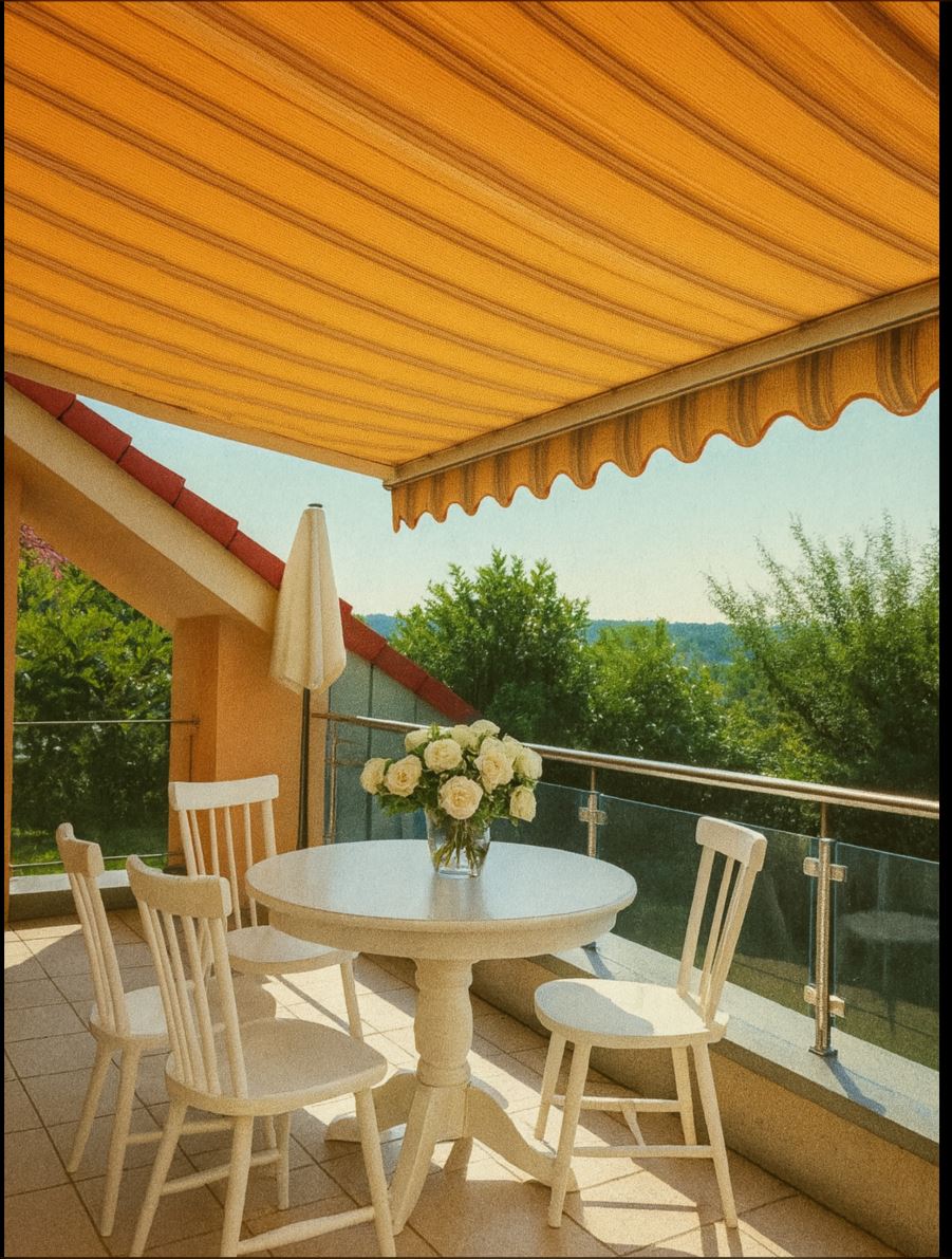 Terrasse im Erdgeschoss sowie eine weitere Terrasse mit Gartenzugang im Untergeschoss – beide mit elektrischen Markisen.