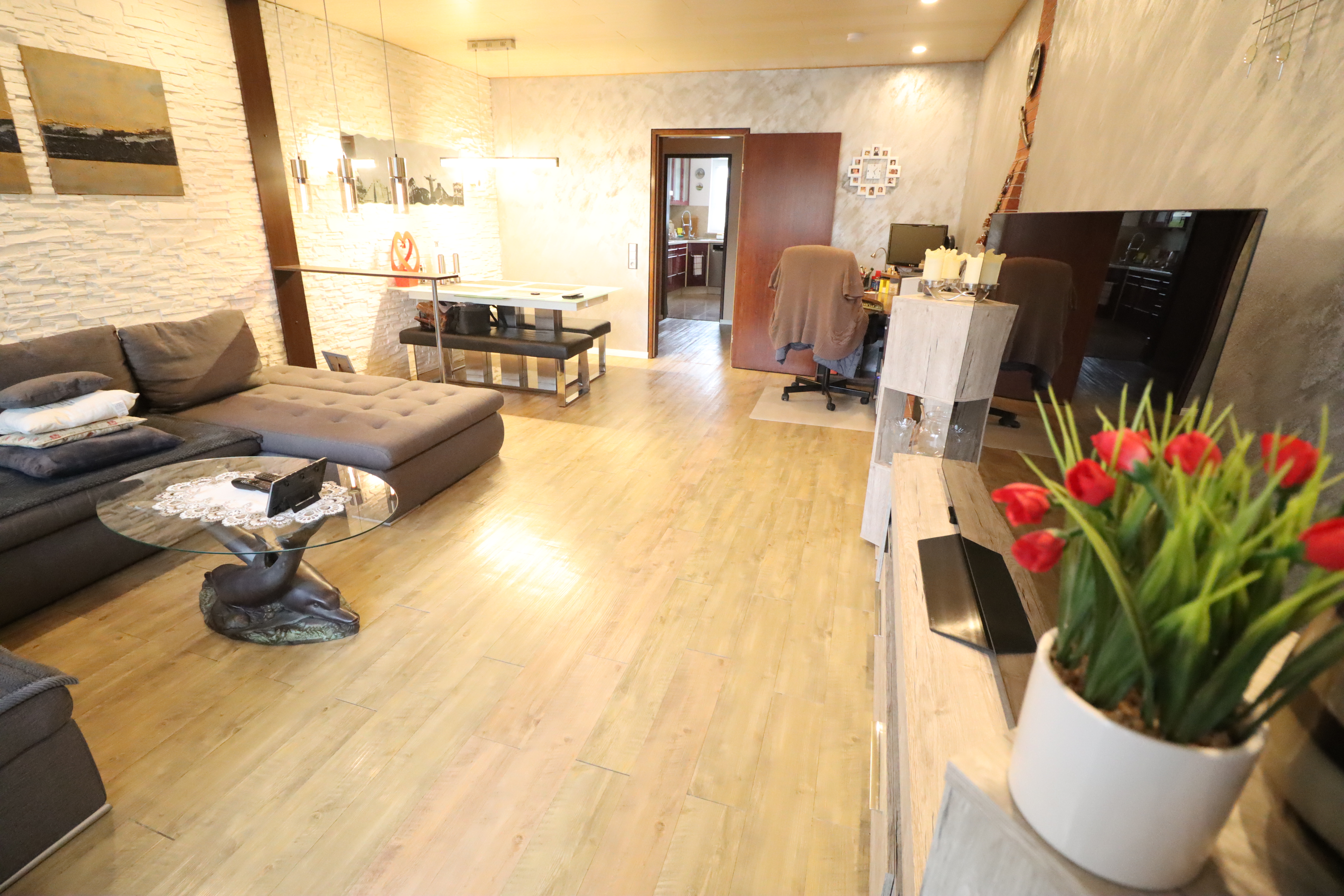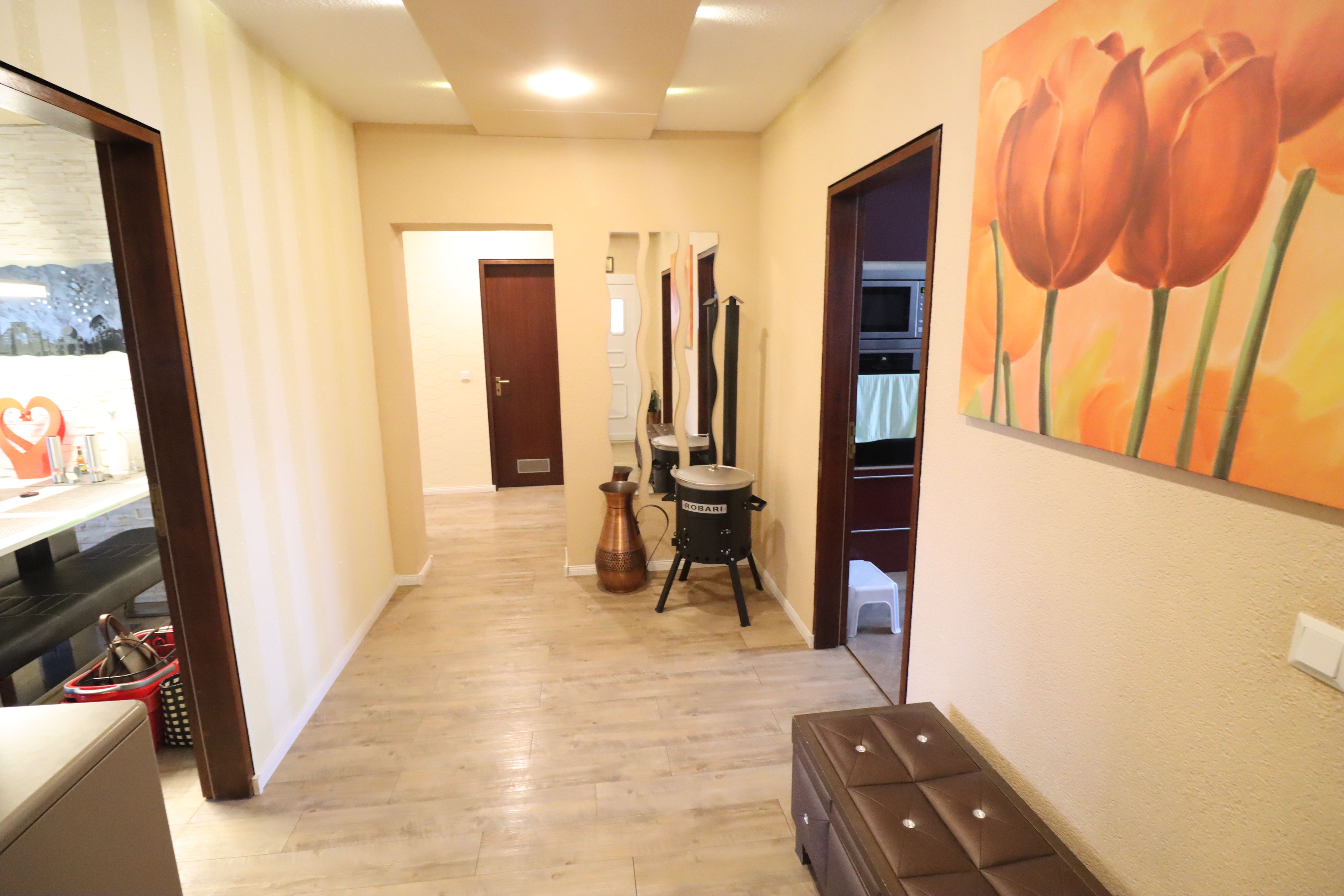 Die Wohnung selbst wurde regelmäßig instand gehalten: Badezimmer und Gäste-WC wurden 2020 erneuert, Fenster (außer Wohnzimmer) 2007 ersetzt (mit elektrischen Rollläden). Böden, Wände und Decken wurden 2010 saniert. Die Elektrik ist dreiadrig ausgeführt; der Verteilerkasten sollte modernisiert werden.